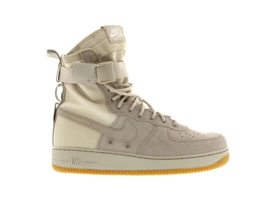 The Nike SF Air Force 1 String is a military-inspired Nike Special Field (SF) Air Force 1 in a ‘String’ colorway. This Nike SF-AF1 features a high-top design and an upper made of suede on the forefoot, quarter panels, eyestays, and Swooshes with ballistic nylon on the tongue and heel. A unique lacing system supported by removable dual ankle straps with plastic clasp closure made of ripstop fabric provides a secure fit. Other details include a hidden Espionage Pocket in the tongue, a branded tongue tag, metallic eyelets, toebox perforations, a heel pull tab, and branded insoles. An Air Force 1 sole unit comprising a String midsole and a gum outsole rounds out the design. Something we love about this Nike SF-AF1 is its stylish and versatile look, which makes it both fashionable and functional. The Nike SF Air Force 1 String was released on January 19th, 2017, for a retail price of $165. - Style 864024-200 - Colorway String/String-String - Retail Price 165 - Release Date 2017-01-19 - Featured false - Product Line Nike Air Force