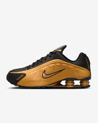 A recrafted version of the early 2000s icon, the Nike Shox R4 replicates the original with its futuristic design lines and performance-like cushioning. Nike Shox columns in the heel distribute weight to maximize comfort while providing a bold look on the streets. Benefits - Synthetic and textile upper is soft and durable. - Nike Shox technology features resilient, flexible columns that compress and regain shape for outstanding cushioning. - Modified, circular Waffle outsole offers great traction. - Laser perforations throughout provide ventilation. Product Details - Foam midsole - Rubber outsole - Not intended for use as Personal Protective Equipment (PPE) - Shown: Metallic Gold/Black/Metallic Gold - Style: HQ1988-700
