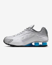 A recrafted version of the early 2000s icon, the Nike Shox R4 replicates the original with its futuristic design lines and performance-like cushioning. Nike Shox columns in the heel distribute weight to maximize comfort while providing a bold look on the streets. Benefits - Synthetic and textile upper is soft and durable. - Nike Shox technology features resilient, flexible columns that compress and regain shape for outstanding cushioning. - Modified, circular Waffle outsole offers great traction. - Laser perforations throughout provide ventilation. Product Details - Foam midsole - Rubber outsole - Not intended for use as Personal Protective Equipment (PPE) - Shown: Metallic Silver/White/Blue Lagoon/Blue Lagoon - Style: HQ1988-005