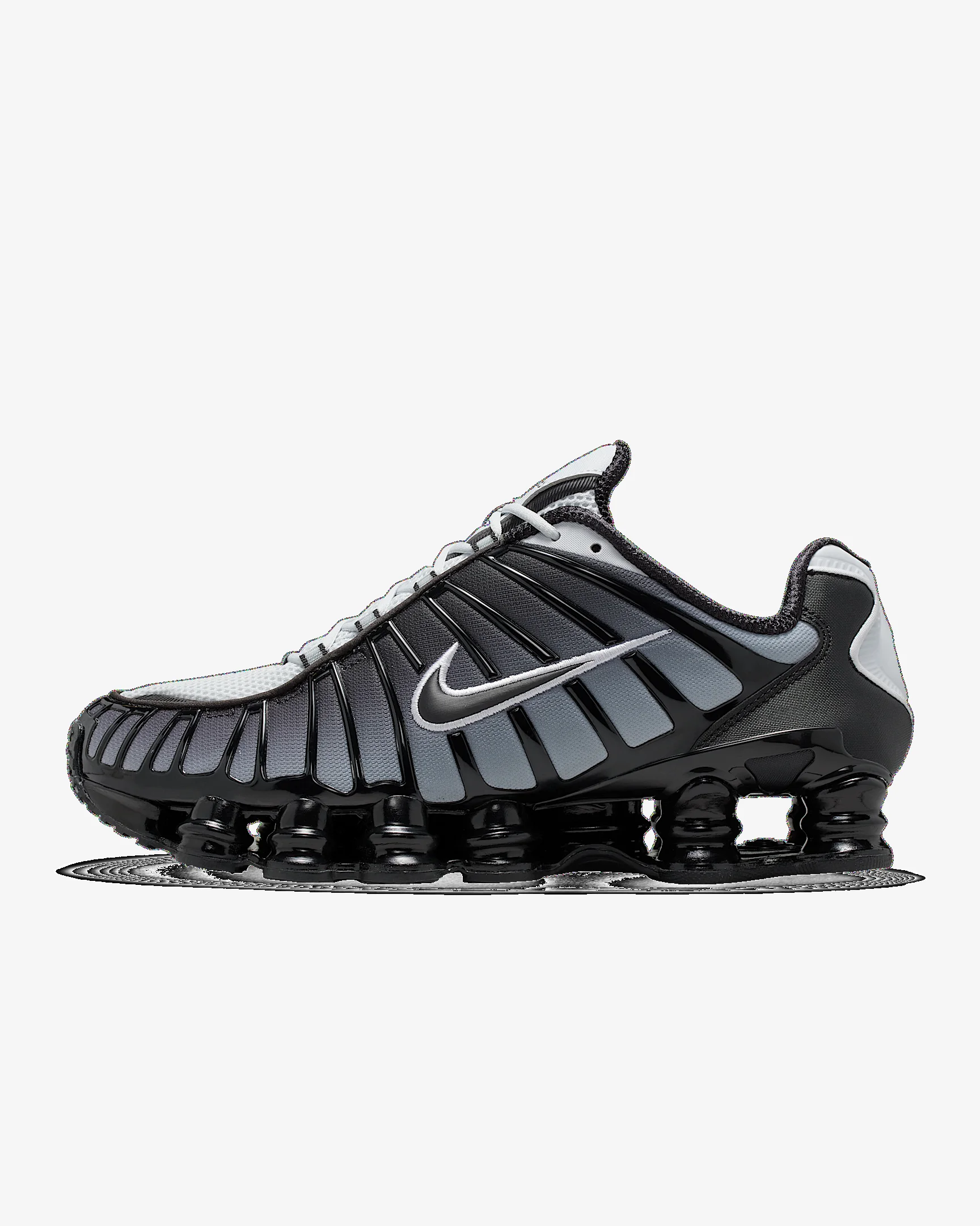 The Nike Shox TL takes mechanical cushioning to the next level. A recrafted version of the 2003 icon, it features breathable mesh in the upper and full-length Nike Shox technology for optimal impact absorption and a bold look on the streets. Benefits - Nike Shox technology combines resilient, flexible columns with moderator plates for outstanding cushioning that compresses and regains its shape. - A combination upper with a full TPU cage is a near-exact replica of the 2003 Nike Shox TL. - Molded overlays throughout the midfoot provide support and a snug fit. - A TPU plate in the heel between the midsole and Nike Shox technology helps provide lateral stability and support. - A foam midsole provides lightweight cushioning. - Non-marking, solid rubber in a modified waffle outsole gives great traction and durability. Product Details - Synthetic and textile upper - Not intended for use as Personal Protective Equipment (PPE) - Shown: Black/Pure Platinum/White - Style: AV3595-017