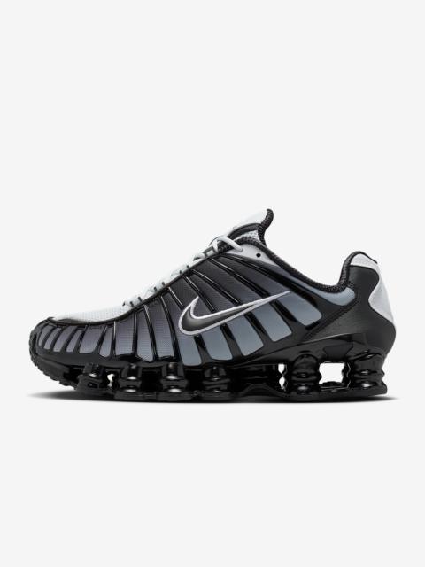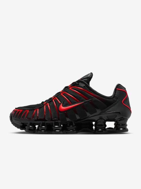 The Nike Shox TL takes mechanical cushioning to the next level. A recrafted version of the 2003 icon, it features breathable mesh in the upper and full-length Nike Shox technology for optimal impact absorption and a bold look on the streets. Benefits - Nike Shox technology combines resilient, flexible columns with moderator plates for outstanding cushioning that compresses and regains its shape. - A combination upper with a full TPU cage is a near-exact replica of the 2003 Nike Shox TL. - Molded overlays throughout the midfoot provide support and a snug fit. - A TPU plate in the heel between the midsole and Nike Shox technology helps provide lateral stability and support. - A foam midsole provides lightweight cushioning. - Non-marking, solid rubber in a modified waffle outsole gives great traction and durability. Product Details - Synthetic and textile upper - Not intended for use as Personal Protective Equipment (PPE) - Shown: Black/Black/Green Strike - Style: AV3595-012