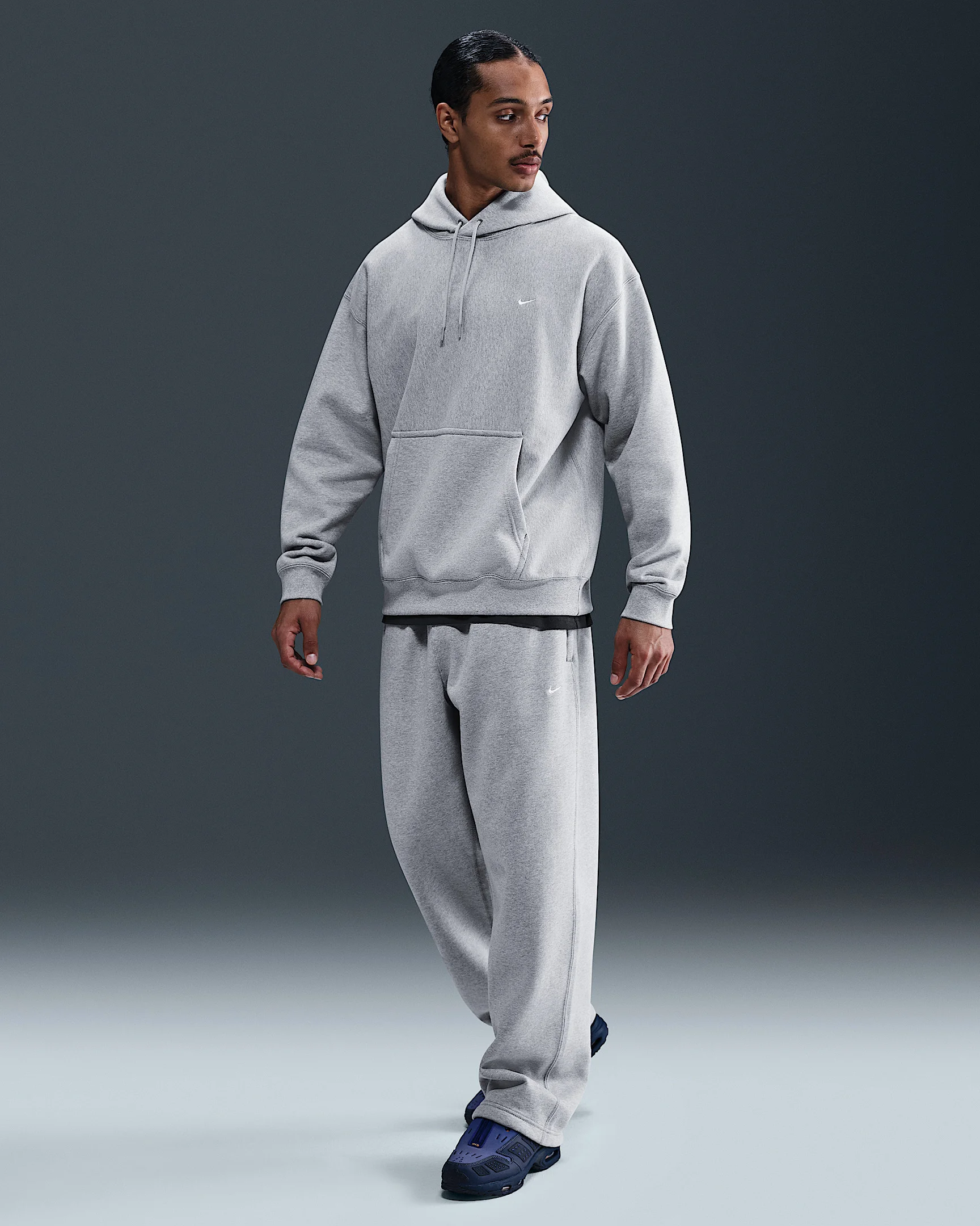 Warm and structured, these pants are crafted with a heavyweight brushed fleece that feels plush on the inside and smooth on the outside. The loose fit and open hem create a casual, relaxed feel. Benefits - Loose fit feels roomy through the seat and thighs. - Elastic waistband has an internal drawcord to let you find the right fit. - Open hem rests on the shoes. Product Details - Embroidered Nike Swoosh logo - Body: 84-85% cotton/15-16% polyester; Pocket bags: 100% cotton. - Material percentages may vary. Check label for actual content. - Machine wash - Imported - Shown: Dark Grey Heather/Light Smoke Grey/White - Style: HV1090-063 SIZE & FIT Model is wearing size M and is 6′1″185cm Loose fit: roomy and relaxed
