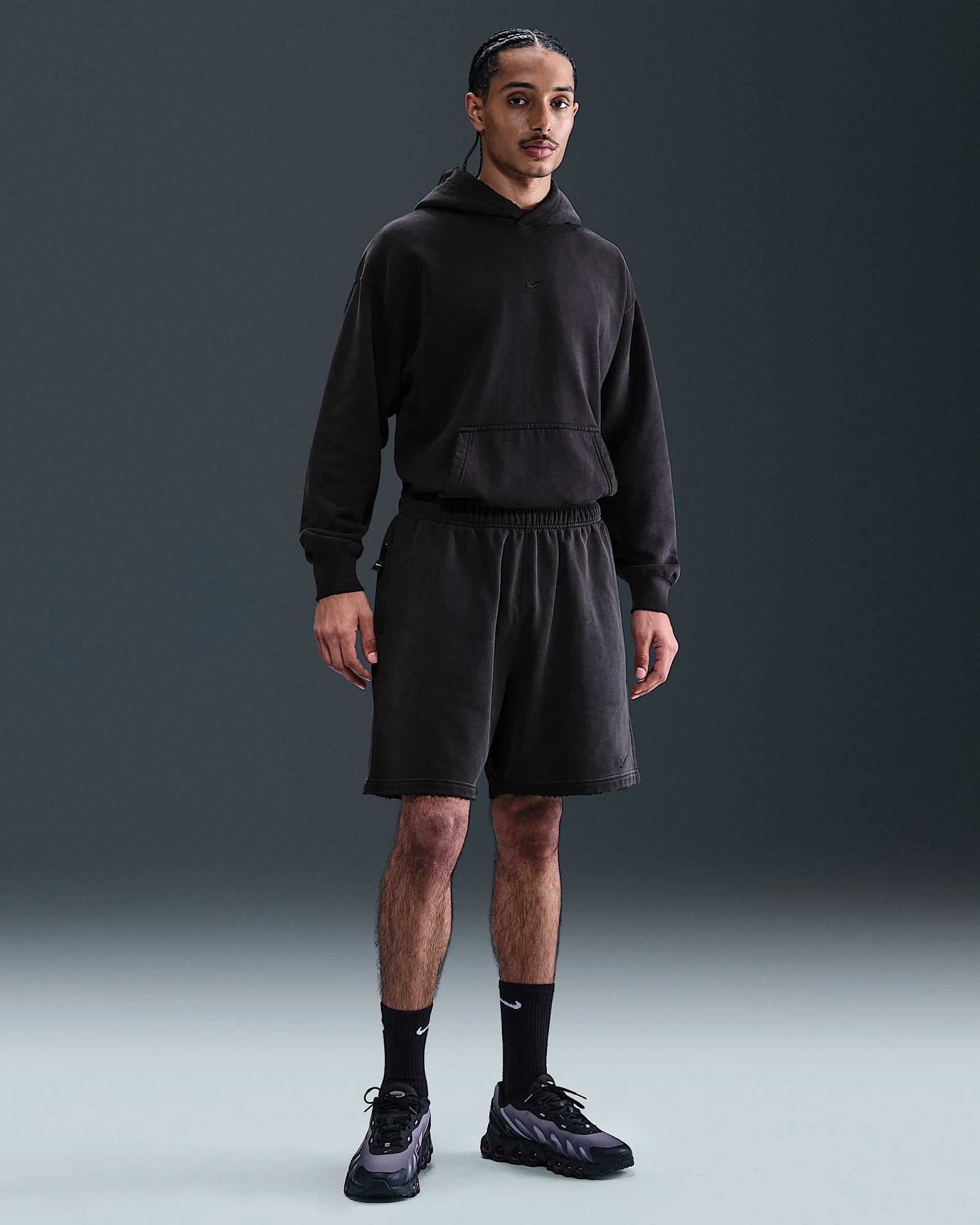 These structured French Terry fleece shorts feature a roomy fit designed to hit above the knee with distressed details and a vintage wash to add a broken-in feel. Product Details - Elastic waistband with drawcord - Hand pockets - Body: 88% cotton/12% polyester. Pocket bags: 100% cotton. - Machine wash - Imported - Shown: Black/Black - Style: IB8955-010 SIZE & FIT Model is wearing size M and is 6′1″185cm Big & Tall model is wearing size 3XL and is 6'5"196cm Oversized fit: exaggerated and spacious