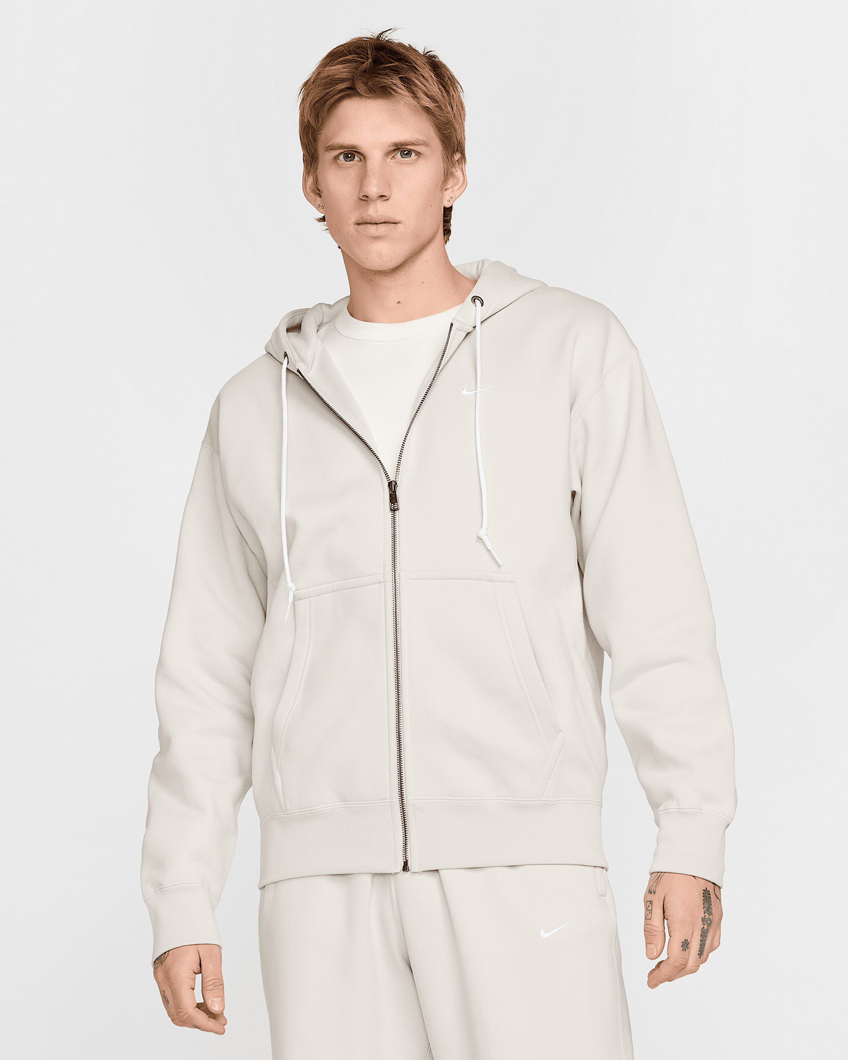 A true classic, our Solo Swoosh full-zip hoodie is made with supersoft fleece for smooth, easy comfort. The simplicity of the design lets you pair it up or down for clean, casual daily wear. Benefits - The Solo Swoosh collection nods to the sports and fashion of the 1990s. and our own In an era of wild and audacious design, the simplicity of the Swoosh was a breath of fresh Air. - French terry fleece is brushed for smooth comfort against your skin. - Roomy fit gives you some extra space through your chest, body and hips for easy comfort and layering. - Full-zip design with sturdy metal zipper lets you adjust your style and coverage with ease. Product Details - Hood with drawcord - Ribbed cuffs and hem - Split Kangaroo pocket - 84-85% cotton/15-16% polyester - Material percentages may vary. Check label for actual content. - Machine wash - Imported - Shown: Light Bone/White - Style: DR0403-072 SIZE & FIT Model is wearing size M and is 6′0″183cm Loose fit: roomy and relaxed Fits large; we recommend ordering a size down