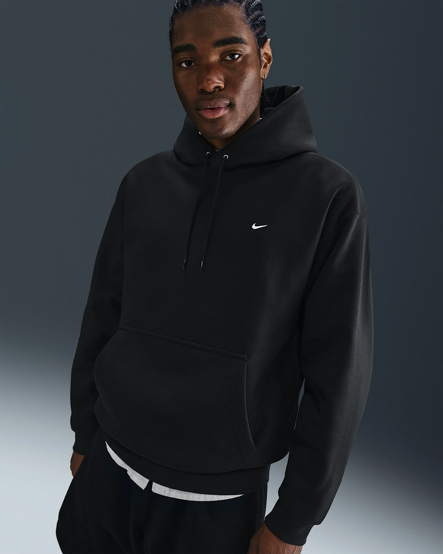 Warm and structured, this hoodie is crafted with a heavyweight brushed fleece that feels plush on the inside and smooth on the outside, bringing a touch of luxury to your casual, cool-weather layers. Benefits - The loose fit feels roomy through the body. - The single-panel, lined hood is equipped with a drawcord to let you dial in the perfect fit. Product Details - Embroidered Nike Swoosh logo - Kangaroo pocket - Ribbed openings - Body: 84-85% cotton/15-16% polyester. Hood lining: 84-85% /cotton/15-16% polyester. - Material percentages may vary. Check label for actual content. - Machine wash - Imported - Shown: Black/Black/White - Style: HV1082-010 SIZE & FIT Model is wearing size M and is 6′2″188cm Loose fit: roomy and relaxed