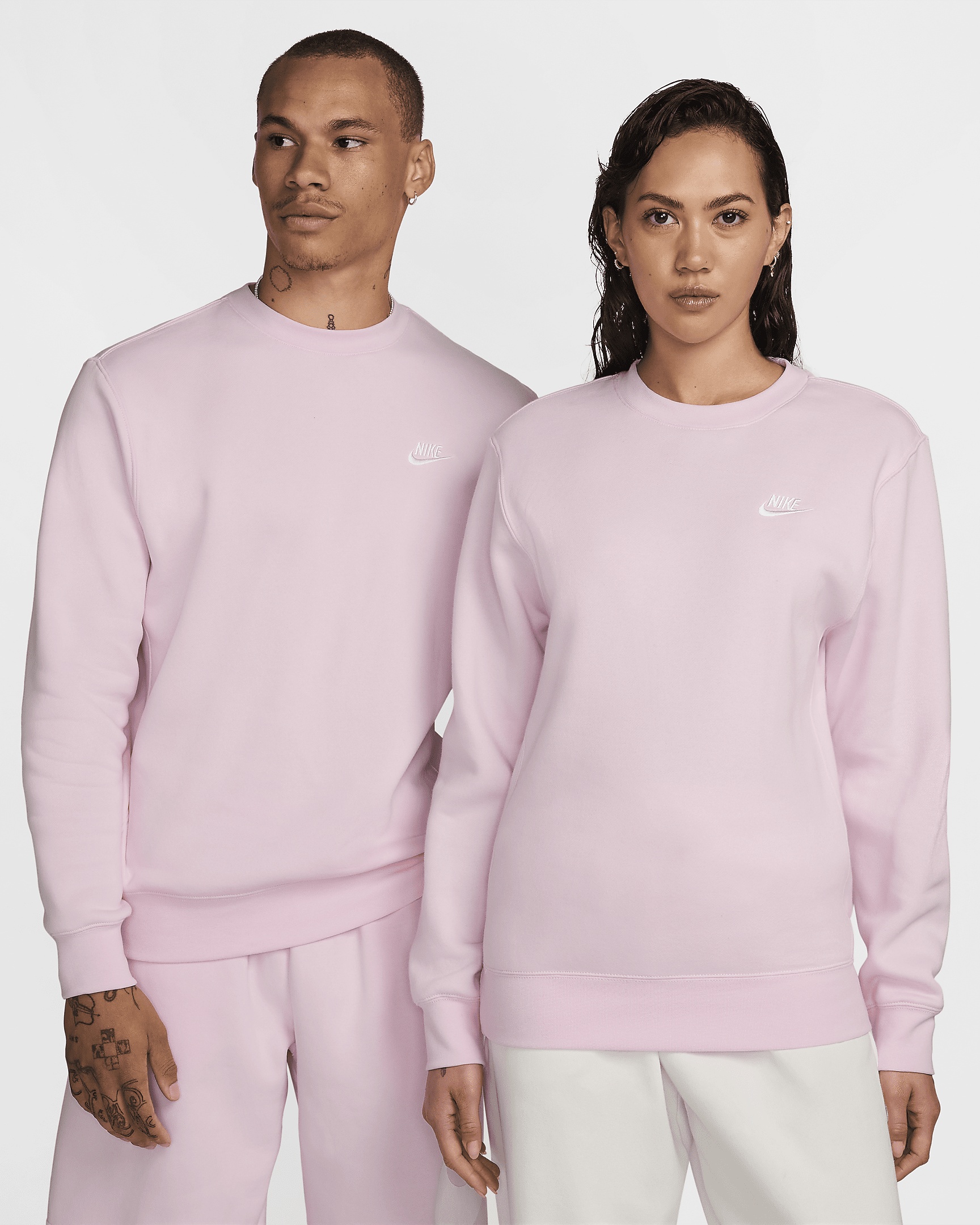A closet staple, the Nike Sportswear Club Fleece Crew combines a classic embroidered logo on the left chest with the soft comfort of fleece for an elevated everyday look. Product Details - Standard fit for a relaxed, easy feel - Fabric: 80-82% cotton/18-20% polyester - Machine wash - Imported - Note: Material percentages may vary depending on factory. Check label for actual content. - Shown: Pink Foam/White - Style: BV2662-663 SIZE & FIT Female model is wearing size XS and is 5'9"175cm Male model is wearing size M and is 6'1"185cm Big & Tall model is wearing size 3XL and is 6'2"188cm Standard fit: easy and traditional
