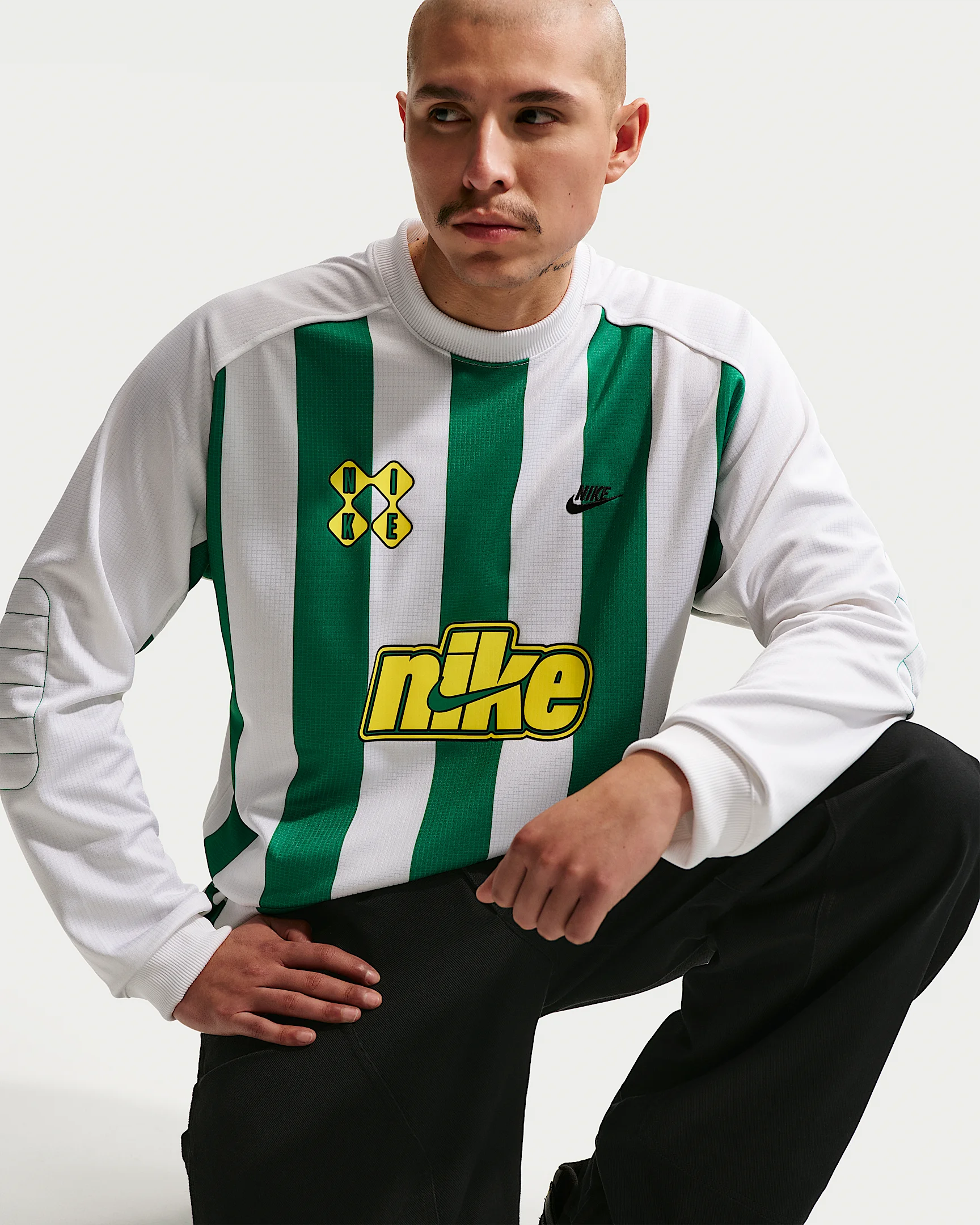 Inspired by the pitch, this jacquard top is made with sweat-wicking fabric and a roomy fit for laid-back, breathable comfort. Elbow pads give it an authentic touch. Product Details - Ribbed collar and cuffs - Body: 100% polyester. Panels fill: 100% polyester. Panels lining: 100% polyester. - Machine wash - Imported - Shown: Malachite/White/Lightning - Style: II4365-365 SIZE & FIT Model is wearing size M and is 5′11″180cm Loose fit: roomy and relaxed