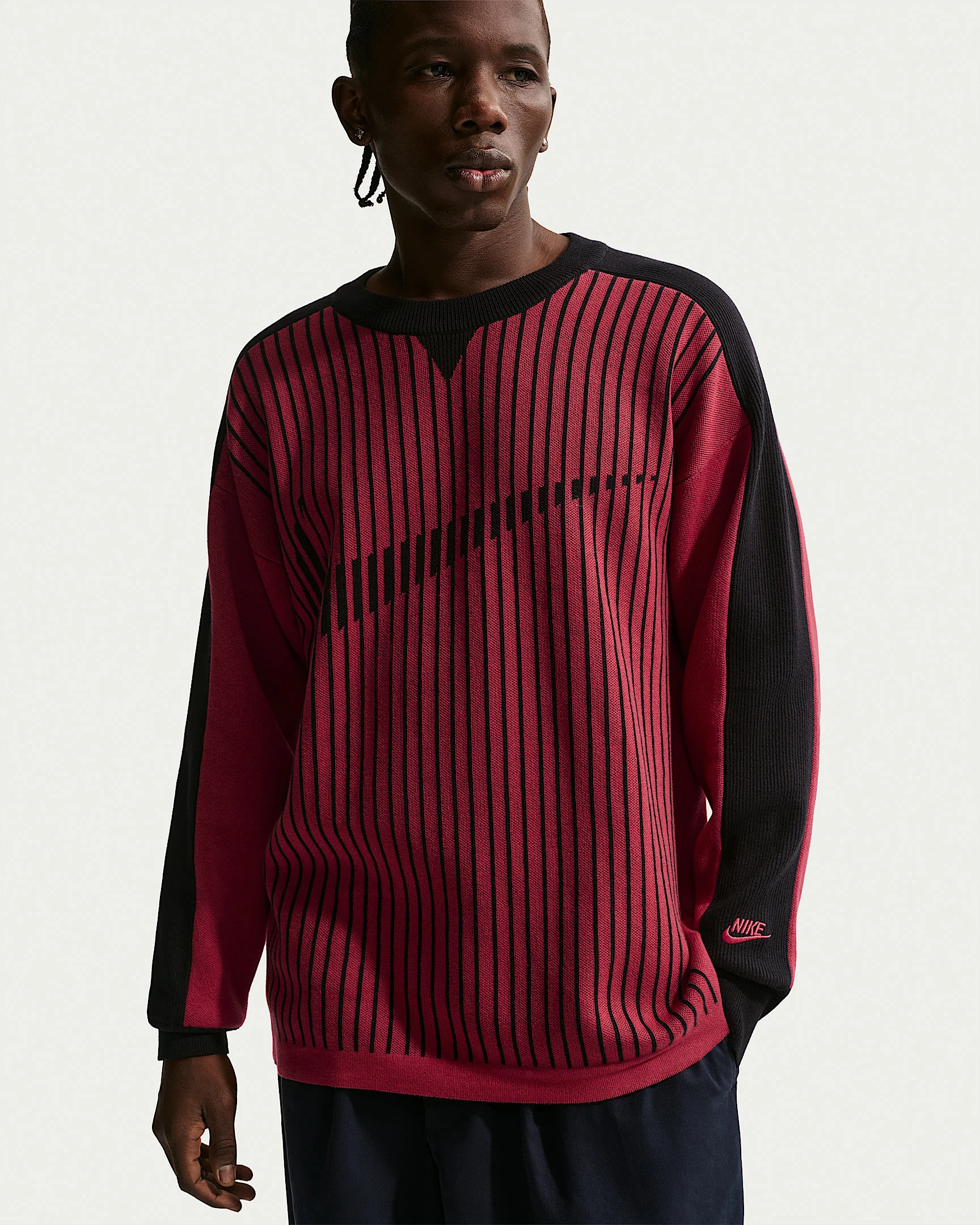 A jacquard Swoosh brings a touch of sport-inspired style to this classic, flat-knit sweater. Its roomy fit has a casual look and is easy to layer. Product Details - 98% cotton/1% spandex/1% polyester. - Machine wash - Imported - Shown: Team Crimson/Black - Style: II1196-613 SIZE & FIT Model is wearing size M and is 6′1″185cm Loose fit: roomy and relaxed