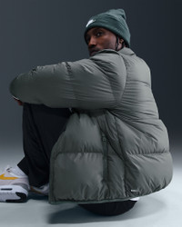 Built to keep you warm and dry when the weather is anything but, this woven jacket is crafted with smooth, water-repellent fabric and equipped with Therma-FIT technology. The loose fit is roomy through the body for easy layering. Benefits - Nike Therma fabric helps keep you warm. - Down insulation creates a premium, lightweight construction that packs in the heat. Product Details - Embroidered Nike Futura logo - Zippered hand pockets - Body: 100% polyester; Lining: 100% polyester; Fill: duck down (Minimum 85% down)/(APA version: 85% duck down/15% feathers) - Machine wash - Imported - Shown: Iron Grey/White - Style: IB2975-068 SIZE & FIT Model is wearing size M and is 6′2″188cm Loose fit: roomy and relaxed