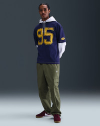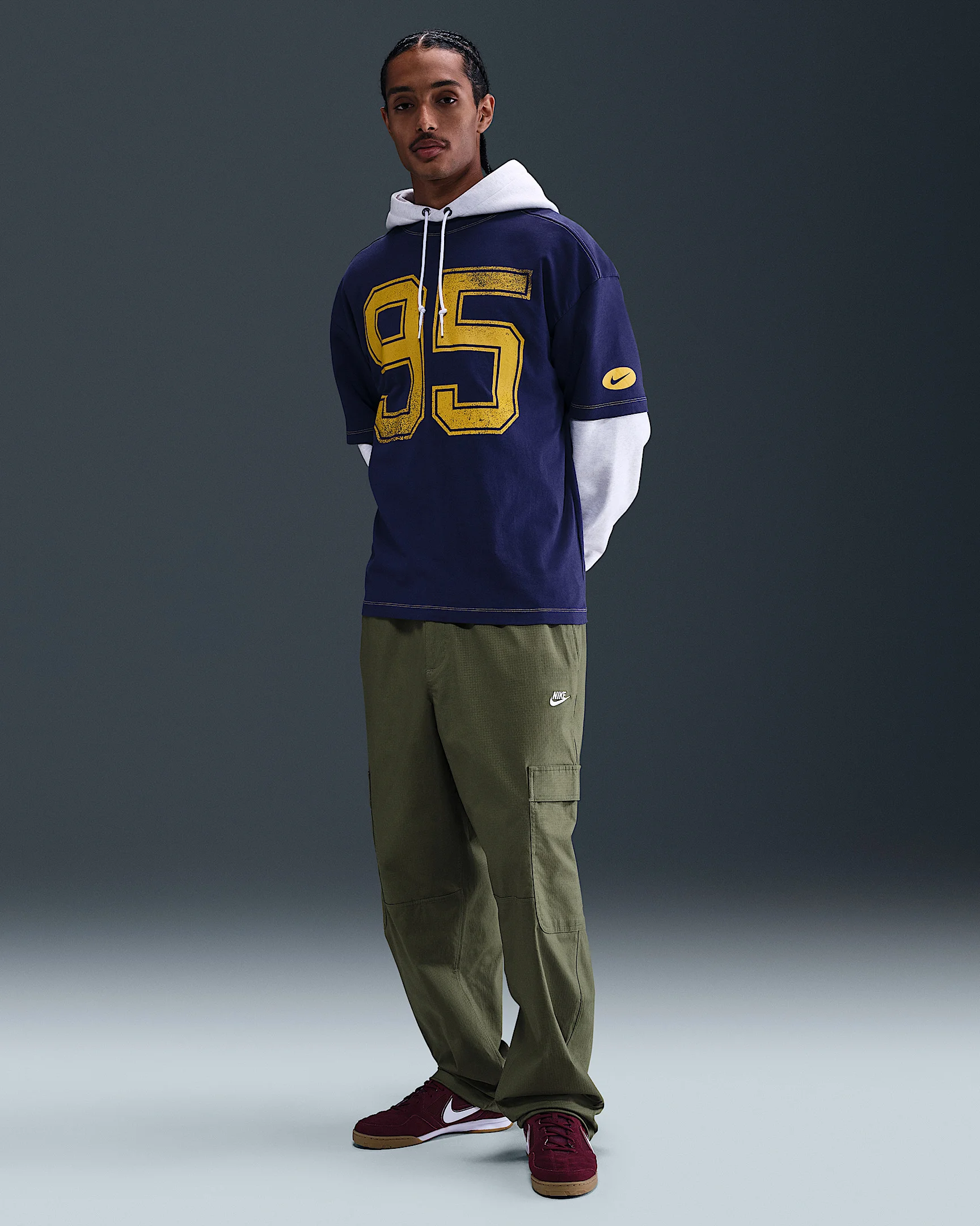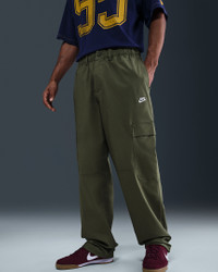 Made for everyday wear, these woven cargo pants add Nike Club comfort to a classic utility style. They're roomy through the seat and thighs with a bungee at the ankle to adjust the fit around your shoes. Benefits - The loose fit feels roomy through the seat and thighs for easy movement and casual styling. - An elastic waistband and button closure deliver a comfortable fit at your waist. Product Details - Embroidered Nike Futura logo - Zipper fly - Hand pockets - Cargo pockets - 97% cotton/3% spandex. Pocket Bags: 87% polyester/13% cotton - Machine wash - Imported - Shown: Medium Olive/White - Style: HV1433-222 SIZE & FIT Model is wearing size M and is 6′1″185cm Loose fit: roomy and relaxed
