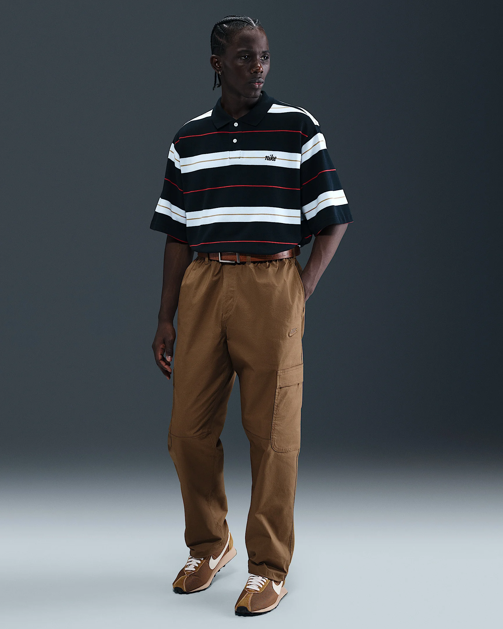 Made for everyday wear, these woven cargo pants add Nike Club comfort to a classic utility style. They're roomy through the seat and thighs with a bungee at the ankle to adjust the fit around your shoes. Benefits - The loose fit feels roomy through the seat and thighs for easy movement and casual styling. - An elastic waistband and button closure deliver a comfortable fit at your waist. Product Details - Embroidered Nike Futura logo - Zipper fly - Hand pockets - Cargo pockets - 97% cotton/3% spandex. Pocket Bags: 87% polyester/13% cotton - Machine wash - Imported - Shown: Mosswood Brown/Mosswood Brown - Style: HV1433-235 SIZE & FIT Model is wearing size M and is 5′11″179cm Loose fit: roomy and relaxed
