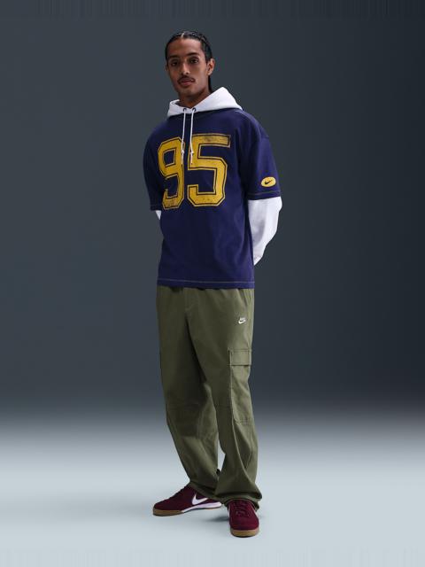 Made for everyday wear, these woven cargo pants add Nike Club comfort to a classic utility style. They're roomy through the seat and thighs with a bungee at the ankle to adjust the fit around your shoes. Benefits - The loose fit feels roomy through the seat and thighs for easy movement and casual styling. - An elastic waistband and button closure deliver a comfortable fit at your waist. Product Details - Embroidered Nike Futura logo - Zipper fly - Hand pockets - Cargo pockets - 97% cotton/3% spandex. Pocket Bags: 87% polyester/13% cotton - Machine wash - Imported - Shown: Ale Brown/White - Style: HV1433-270 SIZE & FIT Model is wearing size M and is 6′0″183cm Loose fit: roomy and relaxed