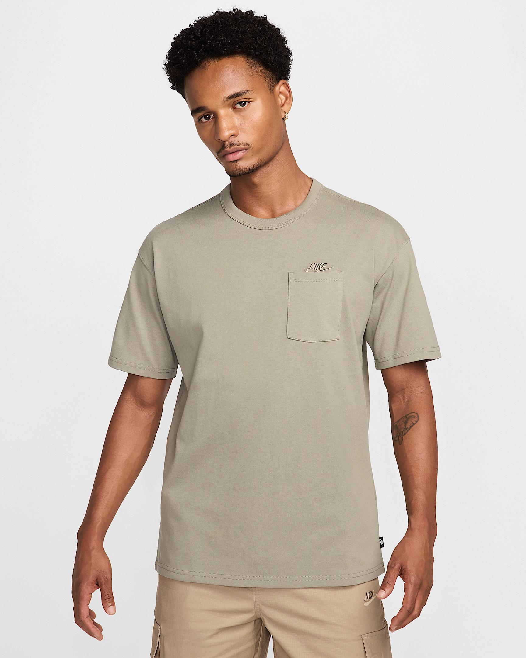 The Nike Sportswear Premium Essentials T-Shirt is made with heavyweight cotton jersey and a loose fit for a soft, sturdy feel you can enjoy for years to come. The embroidered Futura is partially covered by the pocket on this clean, comfortable tee. This product is made with at least 75% organic cotton fibers. Benefits - Dropped shoulders, longer sleeves and a roomy fit through the body and hips give the Max 90 silhouette a relaxed and casual look. - It has a stiff drape and dry hand for a smooth yet sturdy feel. Product Details - Loose fit for a roomy feel - Embroidered Futura logo - Woven label - 100% Cotton - Machine wash - Imported - Shown: Light Army - Style: DQ9295-320 SIZE & FIT Model is wearing size M and is 6′2″188cm Loose fit: roomy and relaxed