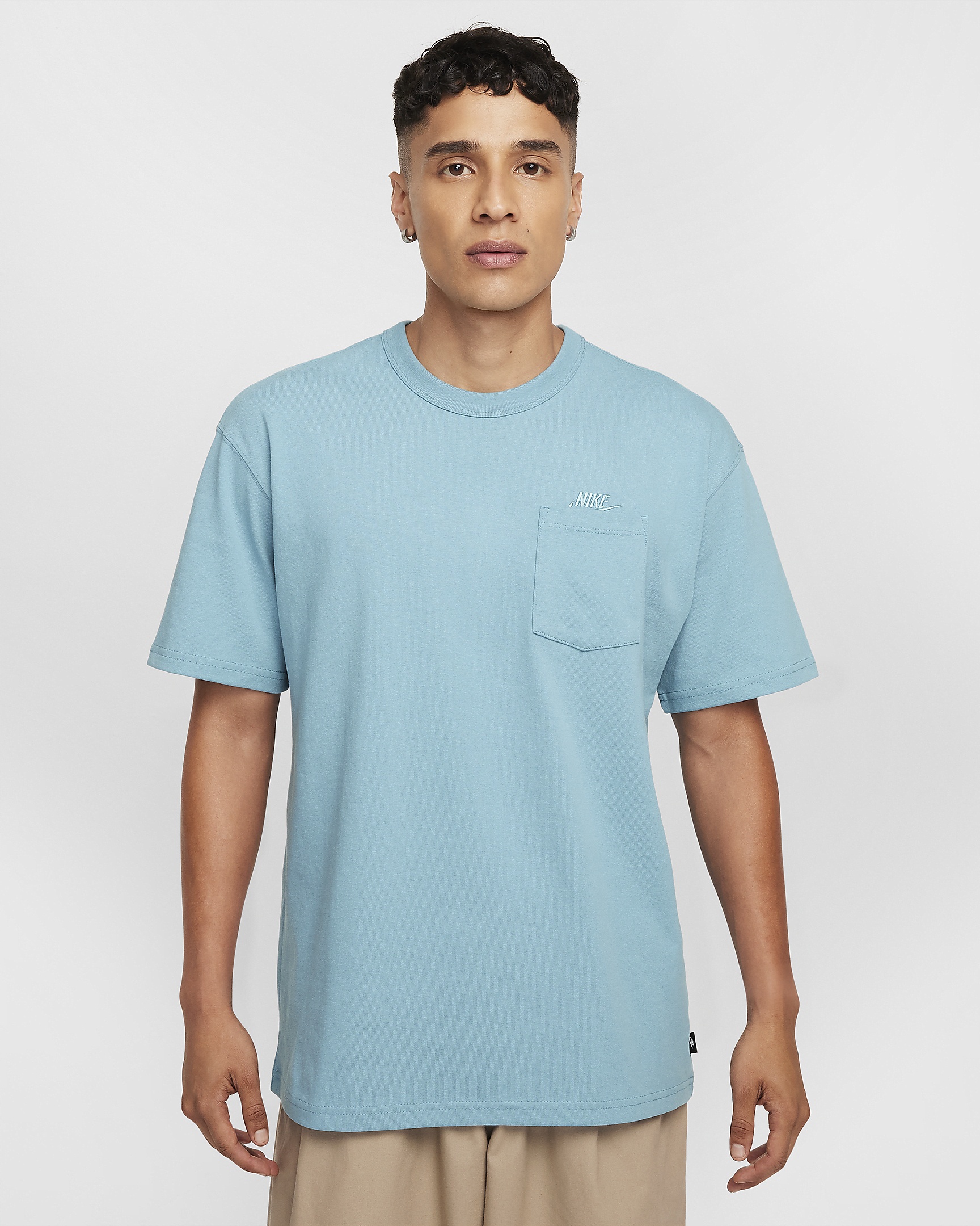 The Nike Sportswear Premium Essentials T-Shirt is made with heavyweight cotton jersey and a loose fit for a soft, sturdy feel you can enjoy for years to come. The embroidered Futura is partially covered by the pocket on this clean, comfortable tee. This product is made with at least 75% organic cotton fibers. Benefits - Dropped shoulders, longer sleeves and a roomy fit through the body and hips give the Max 90 silhouette a relaxed and casual look. - It has a stiff drape and dry hand for a smooth yet sturdy feel. Product Details - Loose fit for a roomy feel - Embroidered Futura logo - Woven label - 100% Cotton - Machine wash - Imported - Shown: Denim Turquoise - Style: DQ9295-464 SIZE & FIT Model is wearing size M and is 6′0″183cm Loose fit: roomy and relaxed