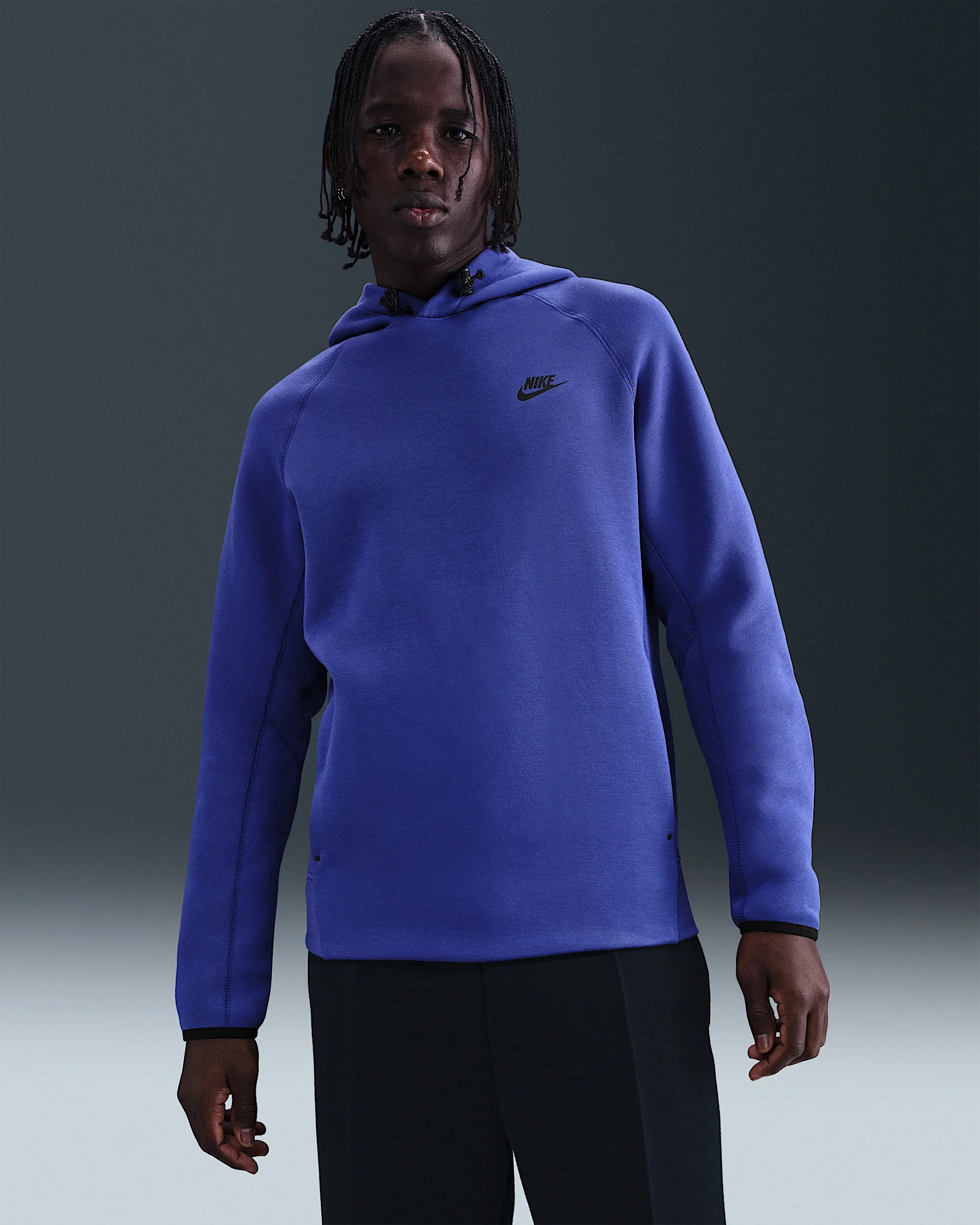 Clean and classic, this pullover hoodie brings premium warmth to a versatile, everyday design. Our premium, smooth-on-both-sides fleece feels warmer and softer than ever, while keeping the same lightweight build you love. Just the right amount of Tech Fleece DNA (like the thin elastic trim at the cuffs) provides a signature finish. Wear it with your Tech Fleece joggers and a pair of Nike sneakers for a uniform look. Benefits - Our premium, lightweight fleece–smooth both inside and out–gives you plenty of warmth without adding bulk. - Designed to feel relaxed through the sleeves and body for an athletic fit you can layer. - Hood with bungee adjusters lets you change up your coverage and style. - Paneled design helps you move with less restriction. Product Details - Hand pockets - Body/Hood Lining: 53% cotton/47% polyester. Pocket Bag Palm Side: 69% cotton/31% polyester. Pocket Bag Knuckle Side: 100% cotton. - Machine wash - Imported - Shown: Deep Night/Black - Style: FB8016-539 SIZE & FIT Model is wearing size M and is 6′1″185cm Standard fit: easy and traditional If you typically wear men's styles, please select your usual size. If you typically wear women's styles, please size down.