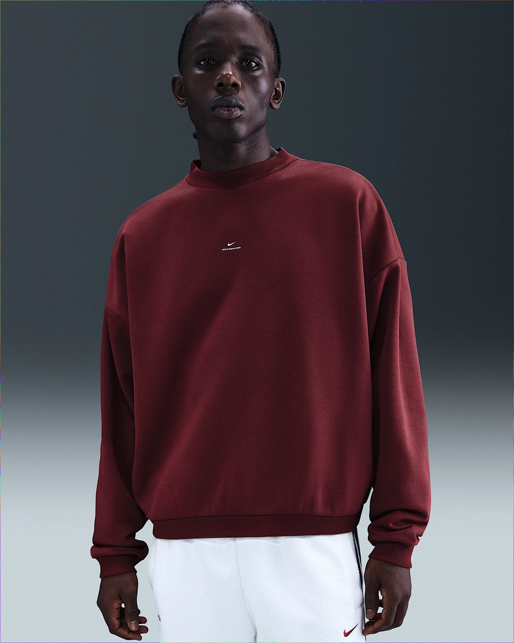 When you want to take your game outside but the temps are a tad chilly, throw on this crew on this loose fitting crewneck. It’s made Nike Therma-Fit, so you can stay warm and keep scorching those nets. Benefits - Nike Therma-FIT technology helps manage your body’s natural heat to help keep you warm in cold-weather conditions. Product Details - Loose fit - French terry with brushed interior - Ribbed collar, cuffs and hem - Hanger loop - Body: 52% polyester/48% cotton. Rib: 96% cotton/4% spandex. - Machine wash - Imported - Shown: Dark Team Red/Pale Ivory - Style: IM5901-619 SIZE & FIT Model is wearing size M and is 6′1″185cm Loose fit: roomy and relaxed
