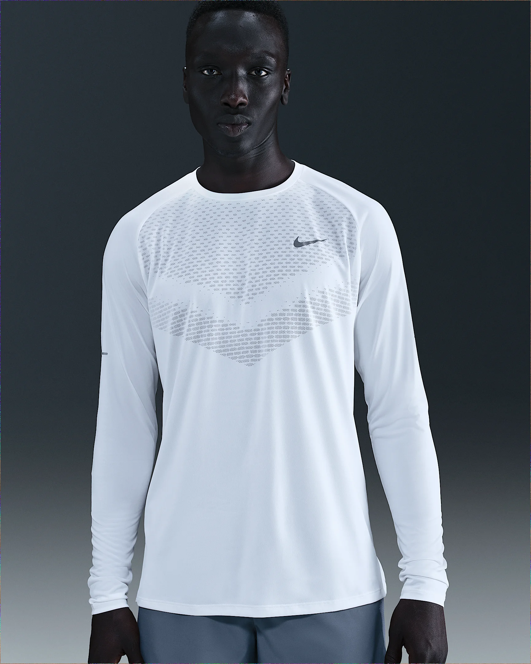 Designed to go for miles, this lightweight top's soft knit fabric is built with sweat-wicking tech and advanced breathability to help you stay dry and comfortable. Benefits - Nike Dri-FIT ADV levels up our sweat-wicking technology with advanced cooling and zones of breathability to help you stay dry and comfortable. - Raglan sleeves help reduce underarm chafing and allow for a wider range of motion. - Extended length helps keep you covered through your stride. Product Details - Reflective details - Not intended for use as Personal Protective Equipment (PPE) - 100% polyester - Machine wash - Imported - Shown: White - Style: HV2702-100 SIZE & FIT Model is wearing size M and is 6′0″183cm Standard fit: easy and traditional