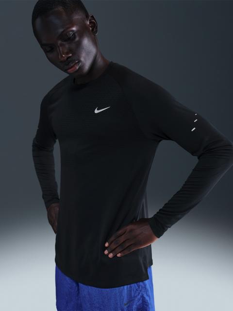 Designed to go for miles, this lightweight top's soft knit fabric is built with sweat-wicking tech and advanced breathability to help you stay dry and comfortable. Benefits - Nike Dri-FIT ADV levels up our sweat-wicking technology with advanced cooling and zones of breathability to help you stay dry and comfortable. - Raglan sleeves help reduce underarm chafing and allow for a wider range of motion. - Extended length helps keep you covered through your stride. Product Details - Reflective details - Not intended for use as Personal Protective Equipment (PPE) - 100% polyester - Machine wash - Imported - Shown: Black - Style: HV2702-010 SIZE & FIT Model is wearing size M and is 6′1″184cm Standard fit: easy and traditional