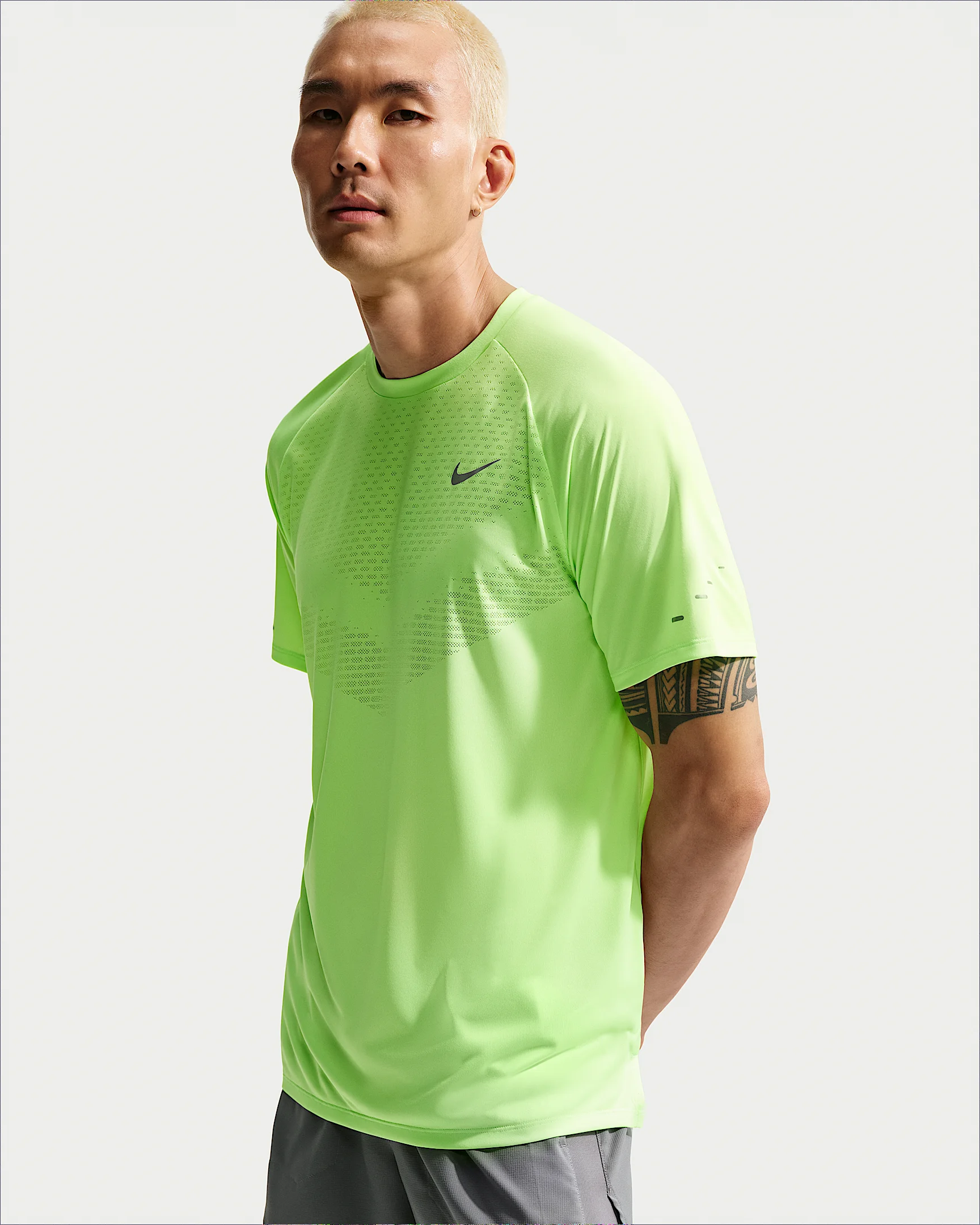 Using insights from runners like you, we prioritized functionality to refresh our Stride essentials. This lightweight top has been designed to help reduce chafing and improve breathability, so you can stay focused on your pace. Product Details - Reflective graphics on sleeves - Reflective Swoosh logo on left chest - Not intended for use as Personal Protective Equipment (PPE) - 100% polyester - Machine wash - Imported - Shown: Lime Blast - Style: HV5203-377 SIZE & FIT Model is wearing size M and is 6'1"185cm Standard fit: easy and traditional Fits large; we recommend ordering a size down