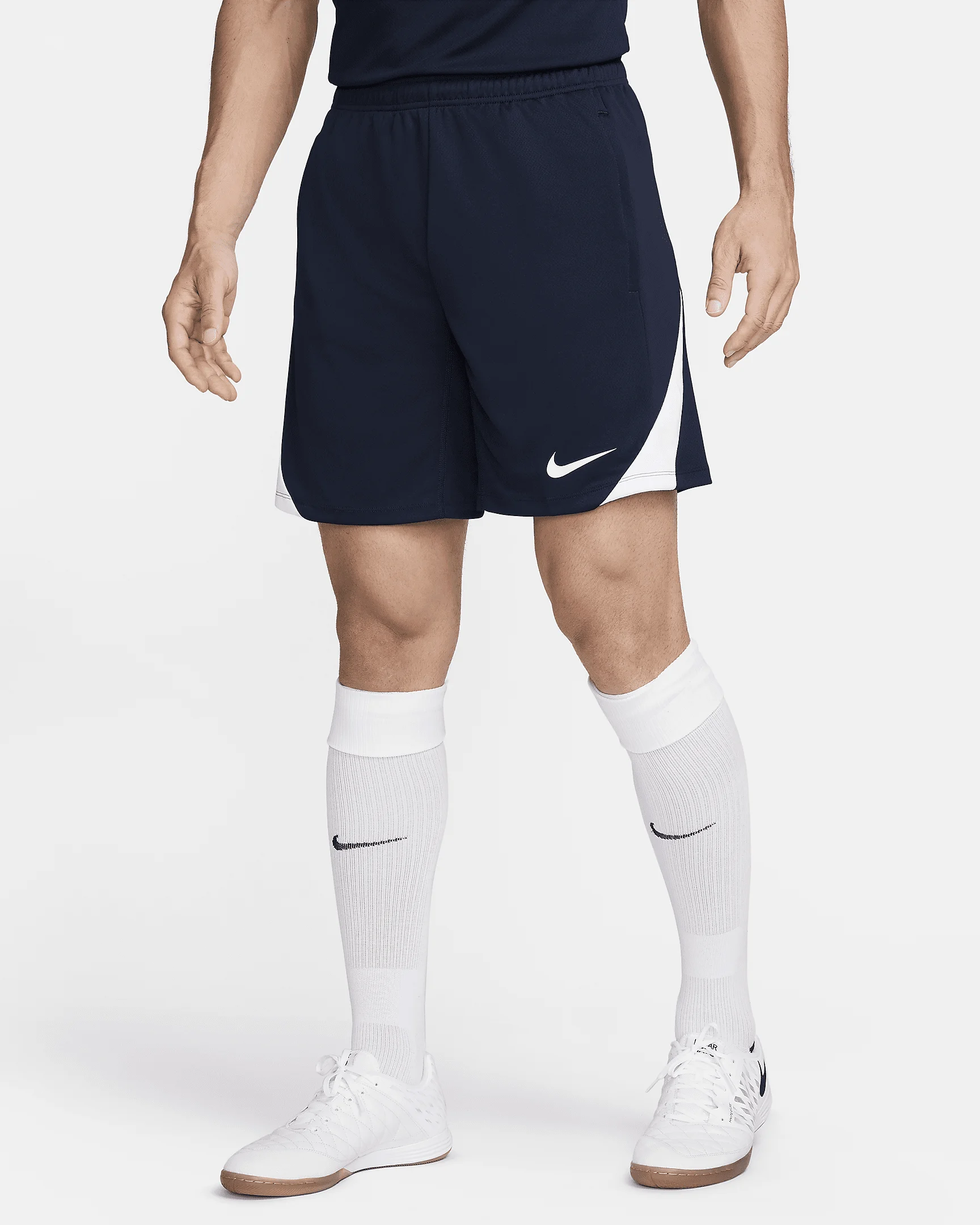 Be your best with the Nike Strike collection—apparel for both elite soccer players and rising stars that helps keep the sweat away on the field. Breathable and sweat wicking, these shorts also have a gusset panel to keep your movement natural and unrestricted. Benefits - Nike Dri-FIT technology moves sweat away from your skin for quicker evaporation, helping you stay dry and comfortable. - Slightly textured stretch-knit fabric is lightweight and breathable. - Elastic waistband with drawcord provides a fit that feels just right. - Gusset design helps maintain a natural range of motion. Product Details - Hand pockets - Ribbed panels - 100% polyester - Machine wash - Imported - Shown: Obsidian/Obsidian/White/White - Style: FN2401-451 SIZE & FIT Model is wearing size M and is 6′2″188cm Standard fit: easy and traditional