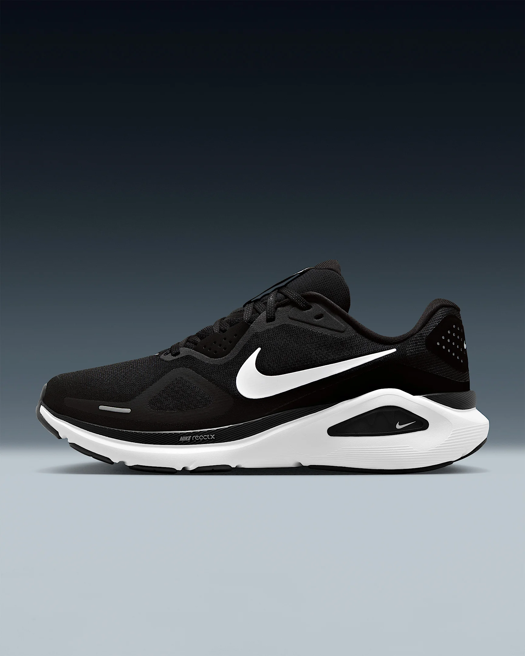 Supportive cushioning in the Structure 26 provides steadiness for everyday runs. A full-length ReactX midsole delivers a cushioned, yet stable transition from heel to toe off. Plus, a tried-and-true midfoot support system wraps around your arch and heel to provide a firm platform. More Benefits - ReactX foam underfoot and higher stack height for stability and support - Lighter, more flexible rubber in forefoot of outsole for cushioning - High-abrasion rubber in heel for increased durability Product Details - Weight: Approx. 321g/11.3oz (Men's US 10) - Heel-to-toe drop: 10mm - Reflective details - Not intended for use as Personal Protective Equipment (PPE) - Shown: Black/Cool Grey/Metallic Silver/White - Style: HJ1102-002