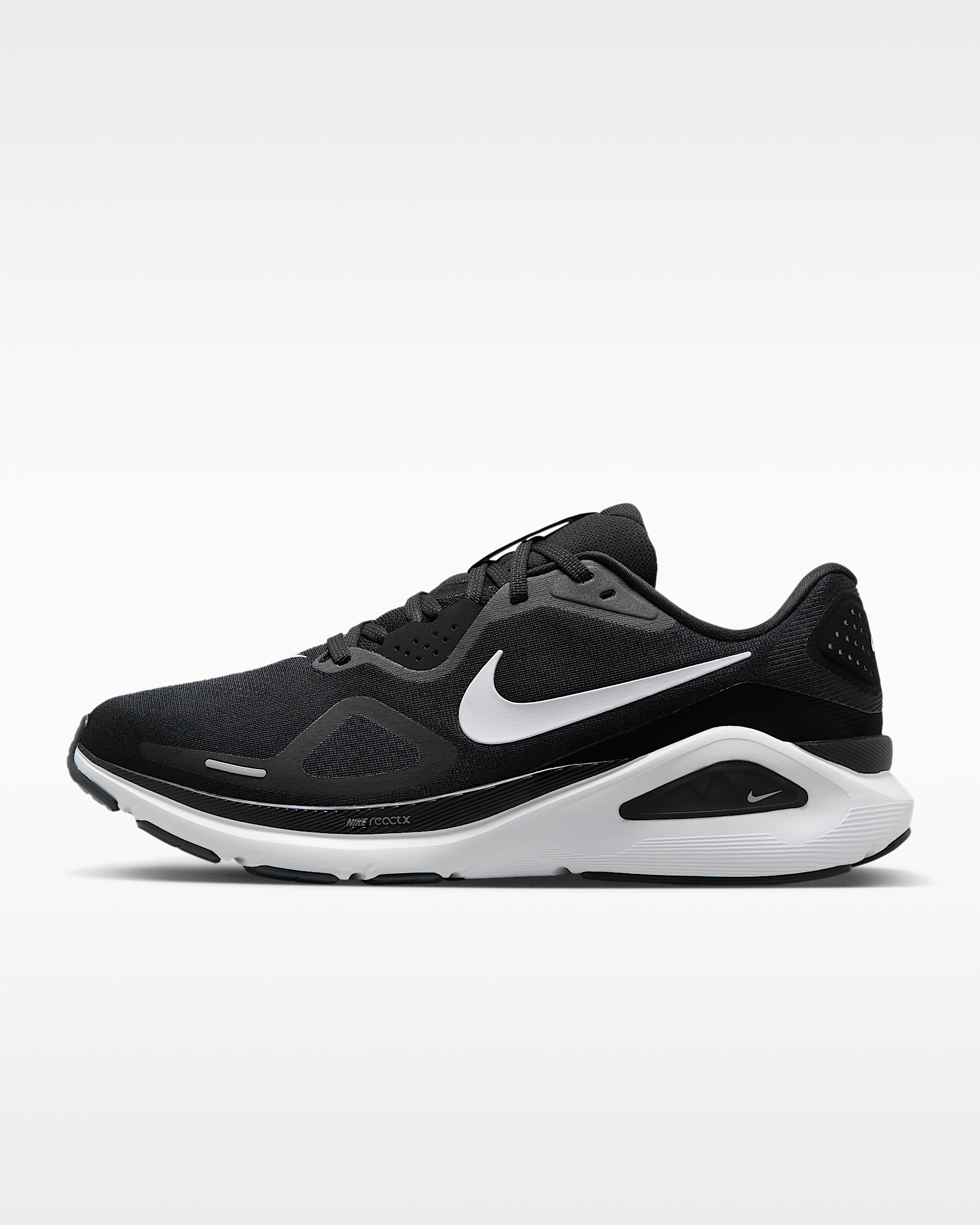 Supportive cushioning in the Structure 26 provides steadiness for everyday runs. A full-length ReactX midsole delivers a cushioned, yet stable transition from heel to toe off. Plus, a tried-and-true midfoot support system wraps around your arch and heel to provide a firm platform. More Benefits - ReactX foam underfoot and higher stack height for stability and support - Lighter, more flexible rubber in forefoot of outsole for cushioning - High-abrasion rubber in heel for increased durability Product Details - Weight: Approx. 321g/11.3oz (Men's US 10) - Heel-to-toe drop: 10mm - Reflective details - Not intended for use as Personal Protective Equipment (PPE) - Shown: Black/Wolf Grey/Metallic Silver/White - Style: HQ2588-001