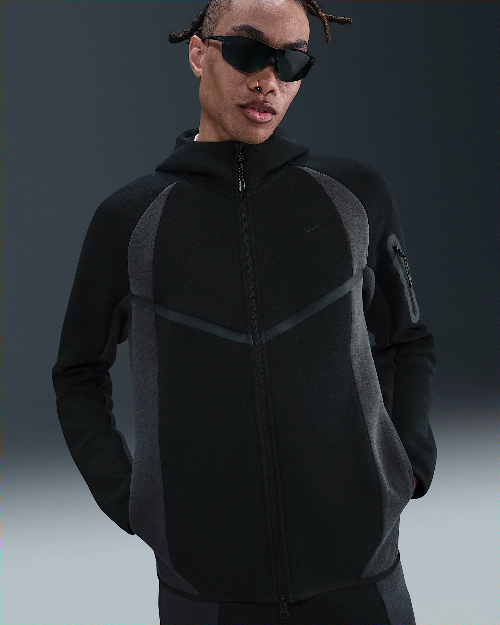 Iconic Nike Windrunner style gets an injection of premium comfort with our smooth-on-both-sides fleece. It's paired with a relaxed fit and technical details, like a signature tape-reinforced Tech pocket on the sleeve and binding at the hem and cuffs. Product Details - Embroidered logo - 2-way zipper - Hand pockets - Body: 53% cotton/47% polyester. Pocket bags: 100% cotton. Hood lining: 53% cotton/47% polyester. - Machine wash - Imported - Shown: Black/Anthracite/Black - Style: IF1325-010 SIZE & FIT Model is wearing size M and is 6′2″188cm Standard fit: easy and traditional