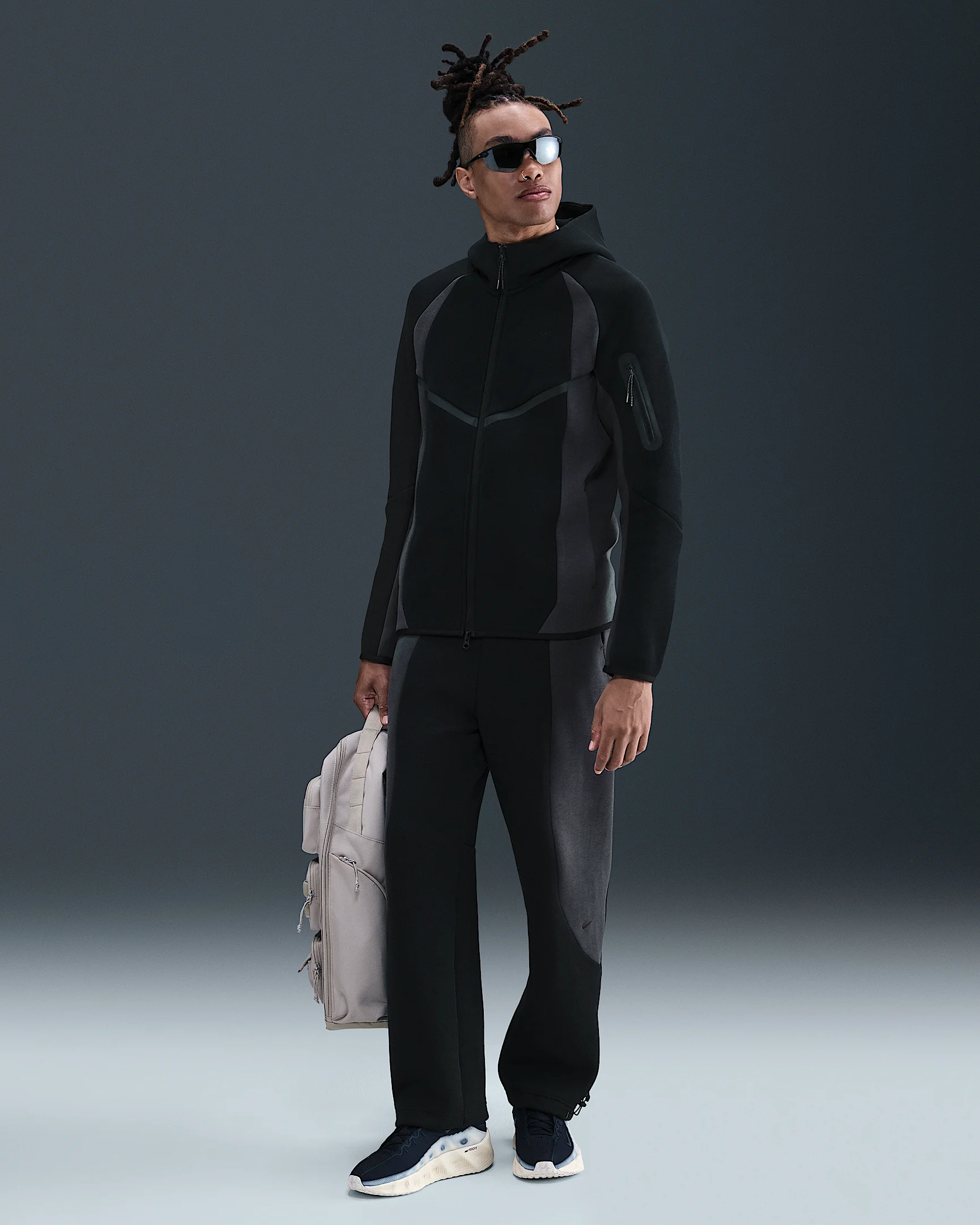 Our Tech Fleece pants offer an injection of premium comfort with our smooth-on-both-sides fleece. They have a relaxed fit and an open hem with bungees to switch up the fit around your shoes. Product Details - Embroidered logo - Elastic waistband with drawcord - Hand pockets - Signature tape-reinforced Tech pocket - Body: 53% cotton/47% polyester. Pocket bag knuckle side: 100% cotton. - Machine wash - Imported - Shown: Black/Anthracite/Black - Style: IF1323-010 SIZE & FIT Model is wearing size M and is 6′2″188cm Standard fit: easy and traditional