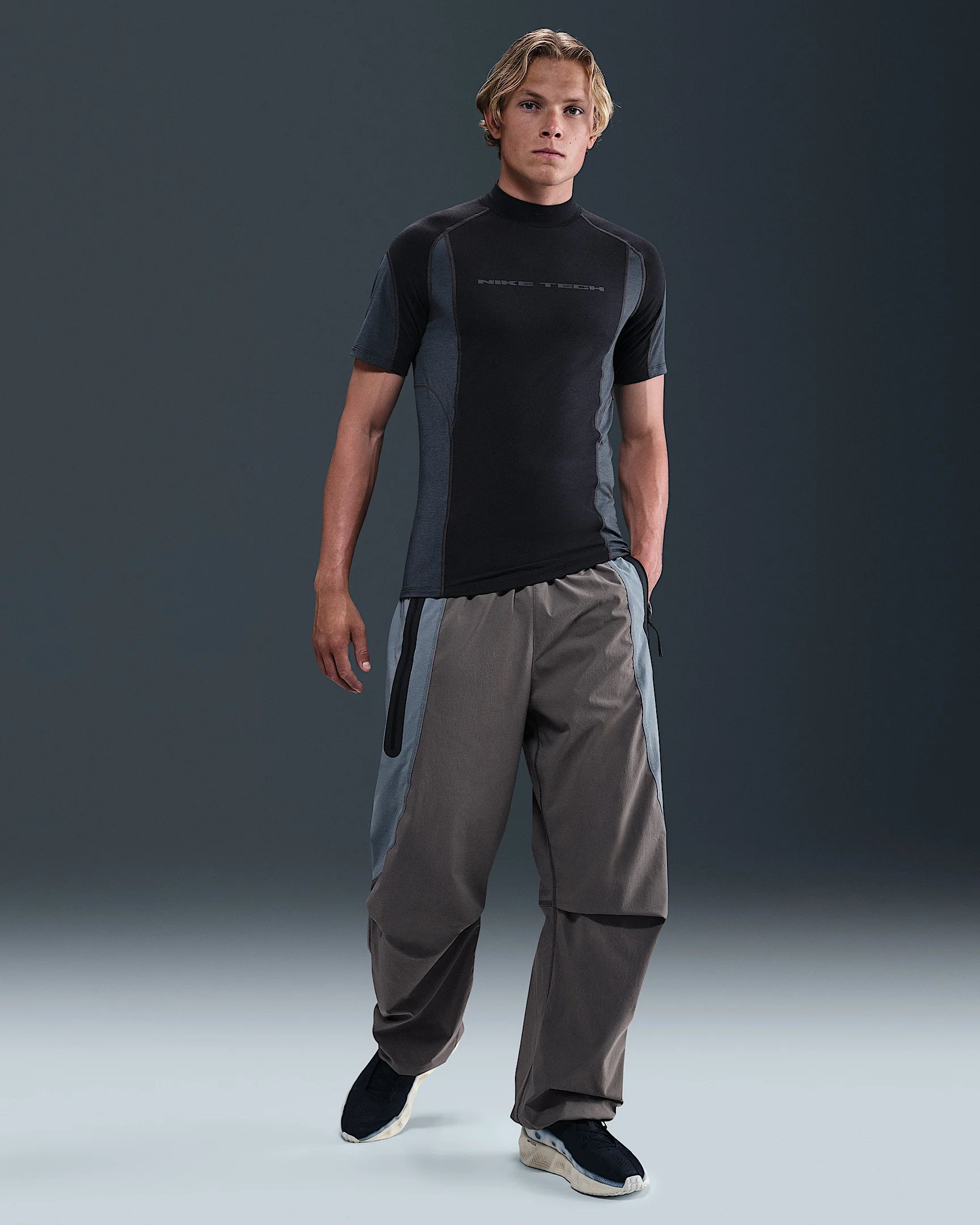 These Tech woven pants are crafted with cool and crinkly nylon fabric that's sweat-wicking and slightly stretchy. They have a relaxed fit, articulation at the knees and bungee-secure cuffs that let you find the right fit at the ankles. Benefits - Nike Dri-FIT technology moves sweat away from your skin for quicker evaporation, helping you stay dry and comfortable. - An elastic waistband and adjustable bungee systems at the hem and cuffs let you find the right fit. - Articulation at the knees offers ease of movement while serving a distinct Nike Tech aesthetic. - An extra-large signature Tech tape-reinforced side pocket has two separate compartments to help you keep your essentials organized. Product Details - Embroidered Nike Swoosh logo - Zippered side hand pocket - Snap secure back pocket - Body: 94% nylon/6% spandex. Pocket bags: 100% polyester. - Machine wash - Imported - Shown: Cave Stone/Cool Grey/Black - Style: IH8466-289 SIZE & FIT Model is wearing size M and is 6′1″185cm Oversized fit: exaggerated and spacious 78 length: hits at ankle