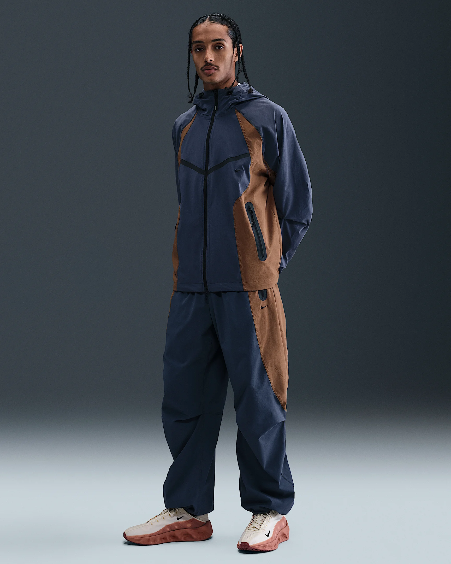 These Tech woven pants are crafted with cool and crinkly nylon blended fabric that's sweat-wicking and slightly stretchy. They have an oversized fit, articulation at the knees and bungee-secure cuffs that let you find the right fit at the ankles. Benefits - Nike Dri-FIT technology moves sweat away from your skin for quicker evaporation, helping you stay dry and comfortable. - An elastic waistband and adjustable bungee systems at the hem and cuffs let you find the right fit. - Articulation at the knees offers ease of movement while serving a distinct Nike Tech aesthetic. - An extra-large signature Tech tape-reinforced side pocket has two separate compartments to help you keep your essentials organized. Product Details - Embroidered Nike Swoosh logo - Zippered side hand pocket - Snap secure back pocket - Body: 94% nylon/6% spandex. Pocket bags: 100% polyester. - Machine wash - Imported - Shown: Thunder Blue/Mosswood Brown/Black - Style: IH8466-437 SIZE & FIT Model is wearing size M and is 6′1″185cm Oversized fit: exaggerated and spacious 78 length: hits at ankle
