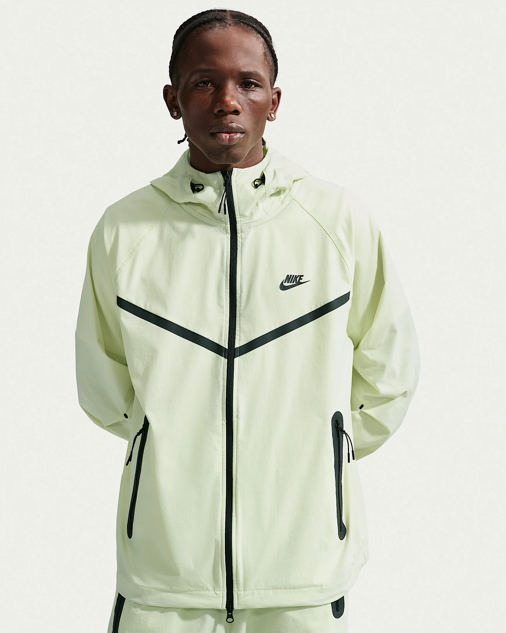 Nike Tech infused with a dose of Nike Heritage. This roomy jacket is crafted with cool and crinkly nylon fabric that's sweat wicking and slightly stretchy. Chevron design lines are inspired by the historic Nike Windrunner track jacket while articulation at the elbows grounds it in a distinct Nike Tech aesthetic. Benefits - Adjustable drawcord and cordlock at the hem and hood let you switch up your fit and coverage. - Roomy fit through the body makes it an easy layer. Product Details - Two-way zipper - Zippered hand pockets - Body: 94% nylon/6% spandex. Pocket bags: 100% polyester. - Machine wash - Imported - Shown: Light Liquid Lime/Light Liquid Lime/Black - Style: IU6965-360 SIZE & FIT Model is wearing size M and is 6′1″185cm Loose fit: roomy and relaxed