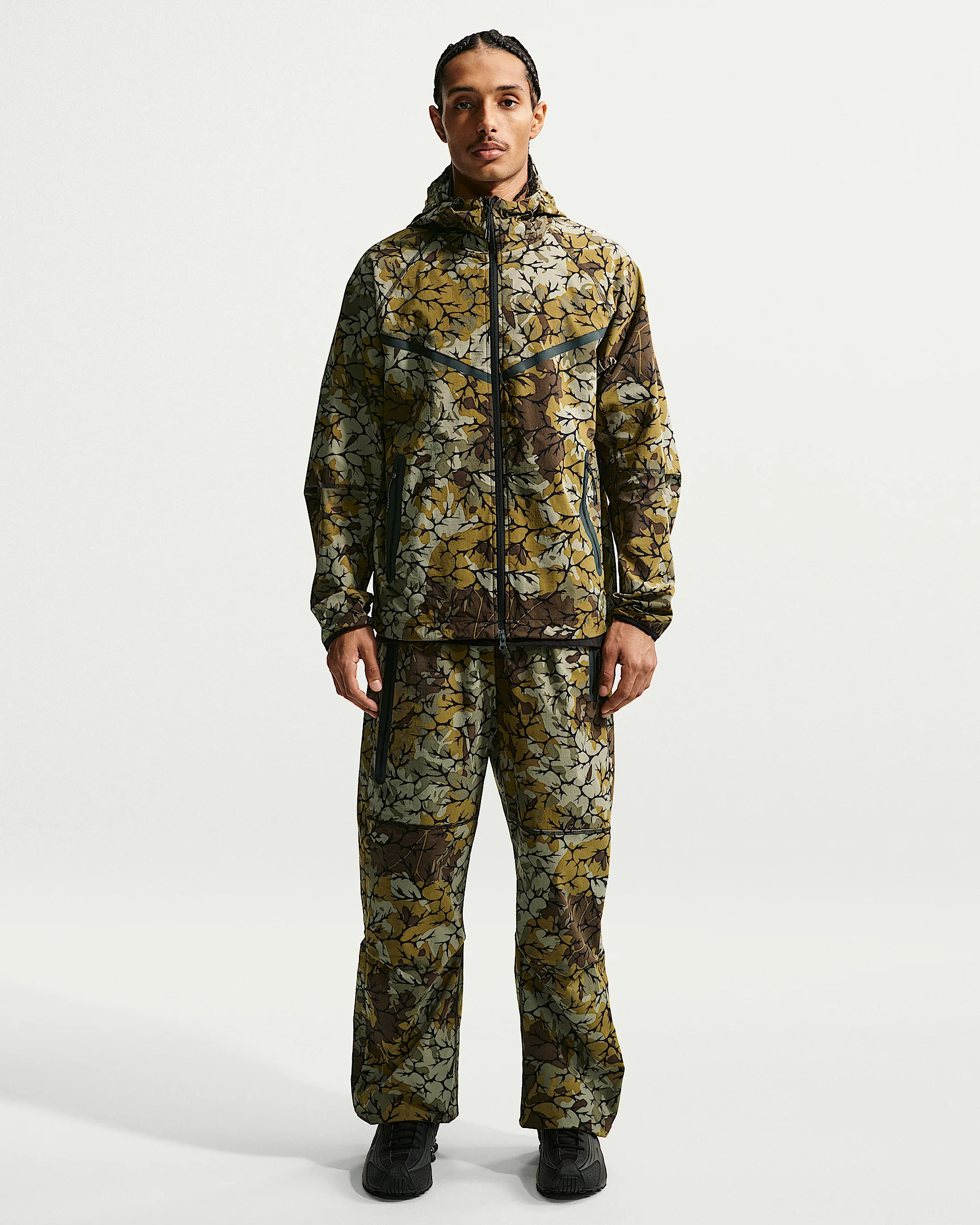 Designed to take on the city, these pants are crafted with cool and crinkly nylon fabric that's sweat wicking and slightly stretchy. They have a roomy fit and articulation at the knees for ease of movement and a distinct Nike Tech aesthetic. Drawcords at the ankles let you switch up the fit around your shoes. Product Details - Embroidered logo - Zippered hand pockets - Back pocket with snap closure - Elastic waistband with drawcord - Body: 94% nylon/6% spandex. Pocket bags: 100% polyester. - Machine wash - Imported - Shown: Olive Flak/Black - Style: IF0911-368 SIZE & FIT Model is wearing size M and is 6′1″185cm Loose fit: roomy and relaxed