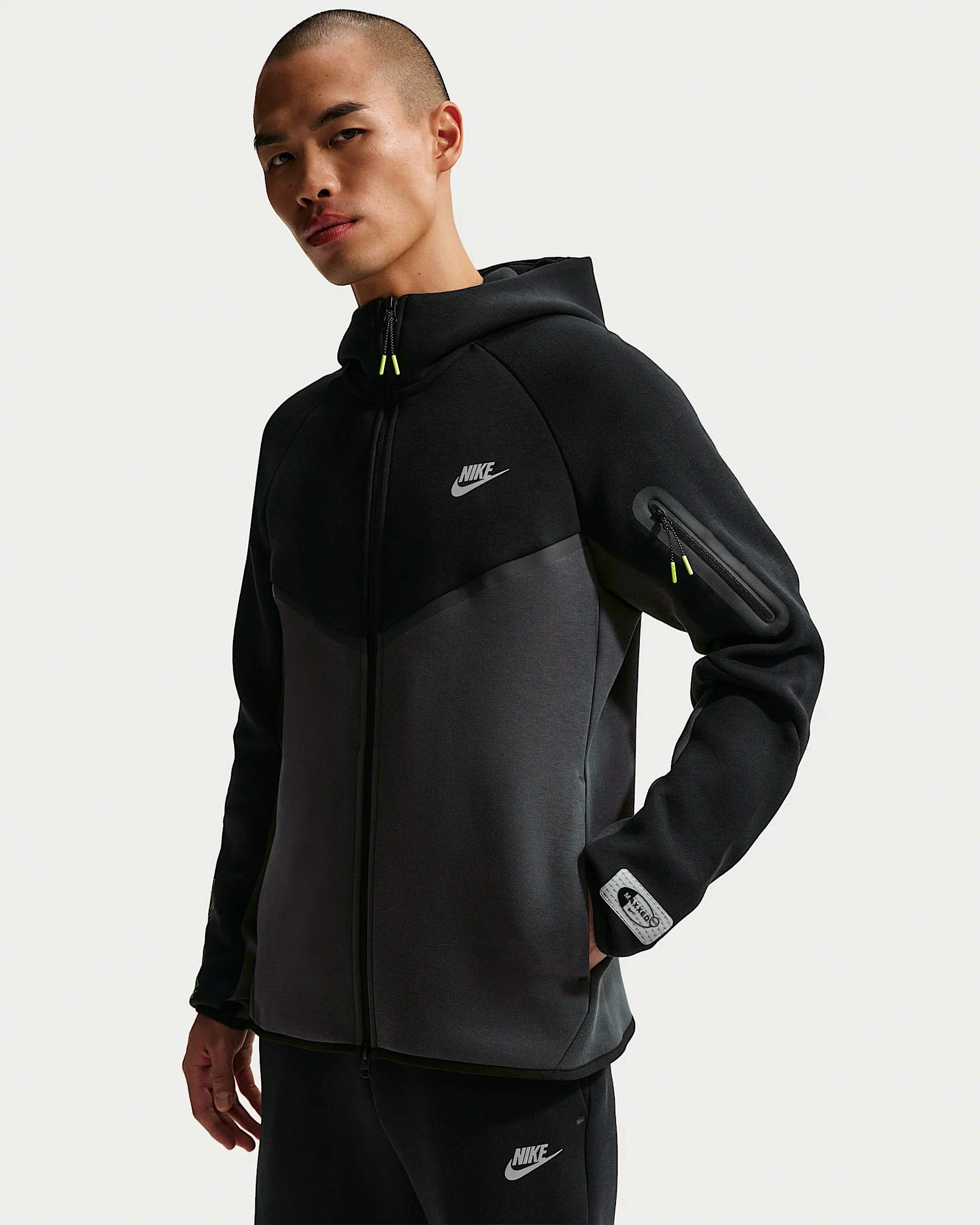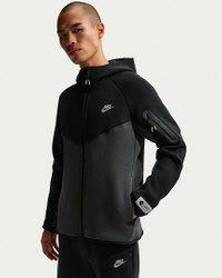 Iconic Nike Windrunner style gets an injection of premium comfort with our smooth-on-both-sides fleece. It's paired with a relaxed fit and technical details, like a signature tape-reinforced Tech pocket on the sleeve and binding at the hem and cuffs. Product Details - Reflective details - Two-way zipper - Hand pockets - Body: 53% cotton/47% polyester. Pocket bag knuckle side: 100% cotton. Hood lining: 53% cotton/47% polyester. - Machine wash - Imported - Not intended for use as Personal Protective Equipment (PPE) - Shown: Black/Dark Smoke Grey/Neon Yellow - Style: IQ1013-010 SIZE & FIT Model is wearing size M and is 5′11″180cm Standard fit: easy and traditional