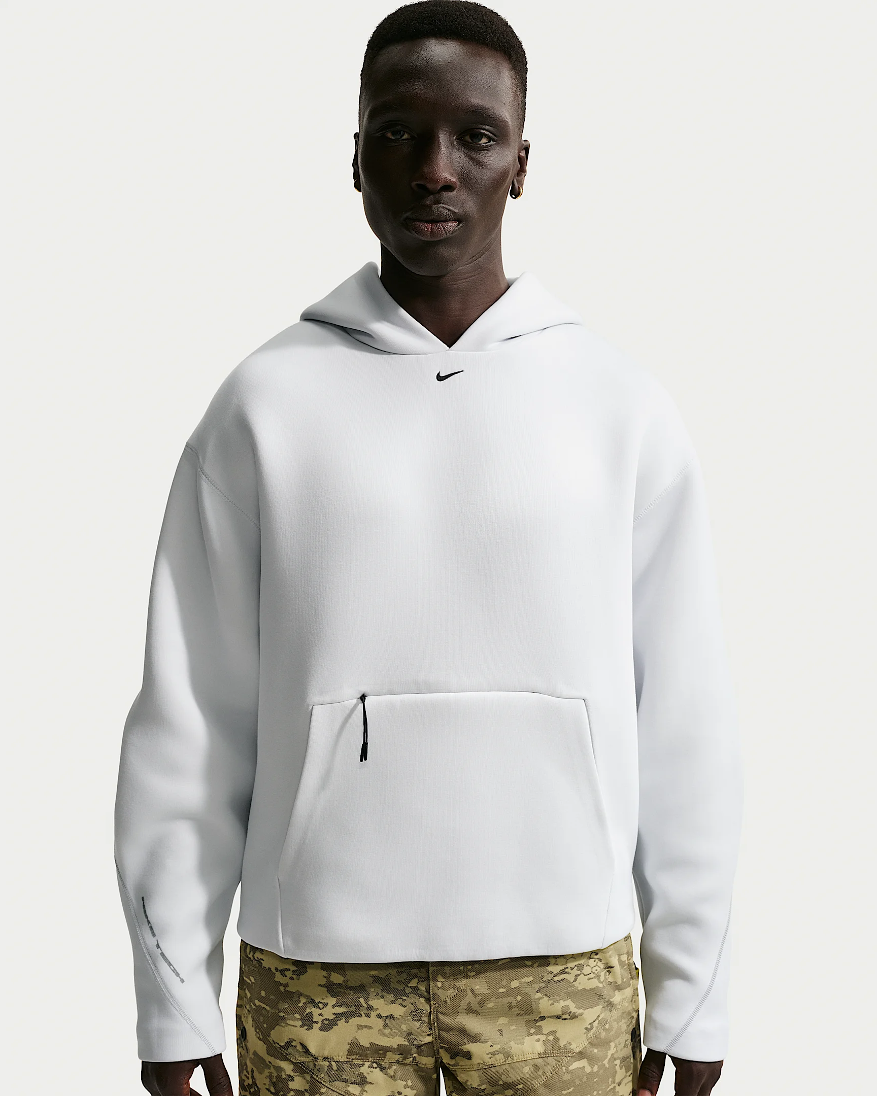 This hoodie is crafted with the thickest and warmest version of our premium, smooth-on-both-sides fleece. It has an extra roomy fit with sculpted articulation for a distinct Nike Tech aesthetic. Benefits - Drawcord at hem lets you switch up the fit at your waist. - Pouch pocket has side entry and separate zipper compartment at top. - Grommets add breathability. Product Details - Embroidered logo - Reflective details - 62% polyester/38% cotton - Machine wash - Imported - Not intended for use as Personal Protective Equipment (PPE) - Shown: Off White/Black - Style: IO9941-101 SIZE & FIT Oversized fit: exaggerated and spacious