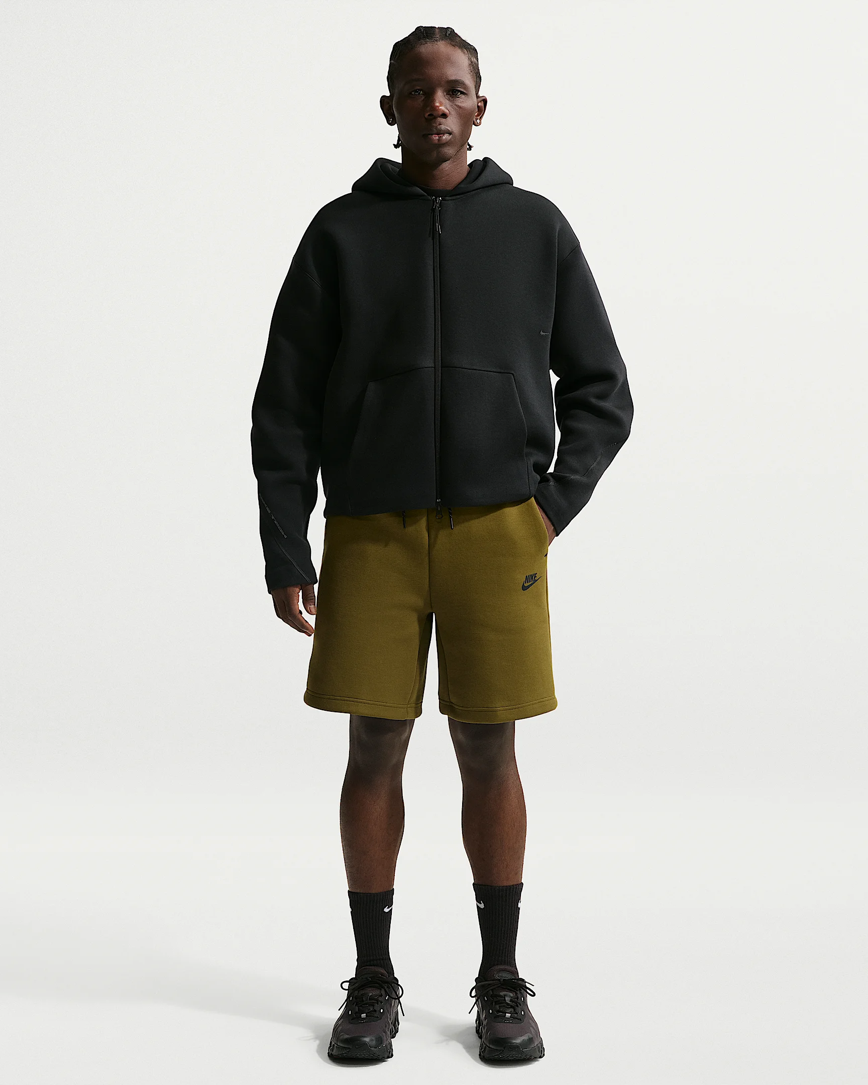 Give your casual looks an injection of premium comfort with our smooth-on-both-sides fleece shorts. A secure Tech pocket lets you know it’s authentic Nike Tech. Benefits - Standard fit feels relaxed through the seat and thighs. - Elastic waistband with bungee and cord lock lets you draw up the perfect fit. - Side drop-in pockets and a signature tape-reinforced Tech pocket on the back thigh offer plenty of storage for your essentials. Product Details - Embroidered Nike Futura logo - Body: 53% cotton/47% polyester; Pocket bags: 100% cotton. - Machine wash - Imported - Shown: Olive Flak/Black - Style: IM0693-368 SIZE & FIT Model is wearing size M and is 6'1"185cm Standard fit: easy and traditional