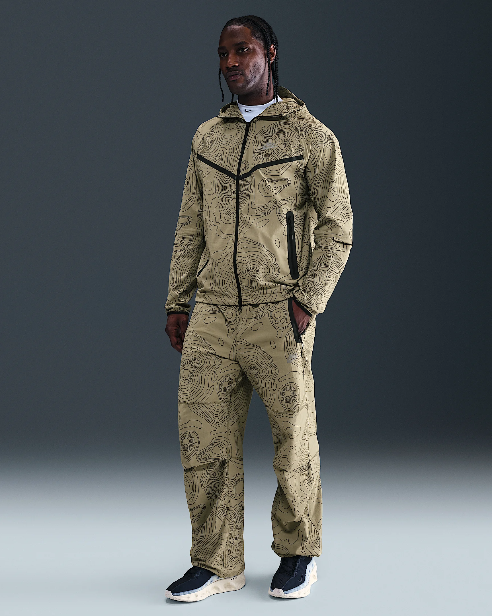 These woven pants are made with cool and crinkly nylon fabric that's sweat wicking and slightly stretchy. Their oversized fit feels extra roomy through the seat and thighs while bungees at the ankles let you switch up the fit around your shoes. Benefits - Elastic waistband and bungees let you find the right fit. - Articulation at the knees offers ease of movement while serving a distinct Nike Tech aesthetic. - Extra large signature Tech tape-reinforced side pocket has two separate compartments to help keep your essentials organized. Product Details - Reflective logo - Not intended for use as Personal Protective Equipment (PPE) - Body: 94% nylon/6% spandex. Pocket bags: 100% polyester. - Machine wash - Imported - Shown: Neutral Olive - Style: IM7838-276 SIZE & FIT Oversized fit: exaggerated and spacious 78 length: hits at ankle