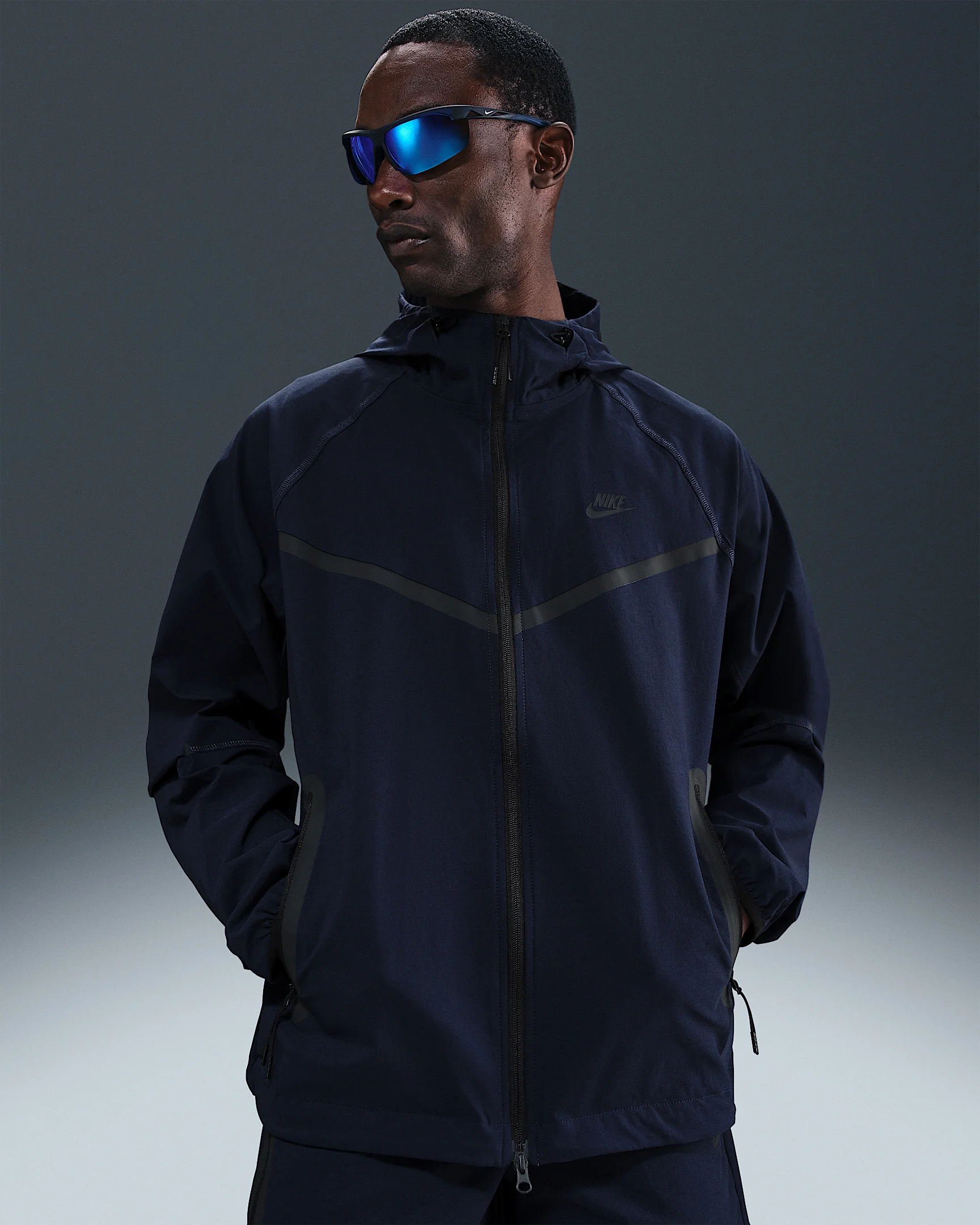 Crafted with stretchy, breathable material, the Nike Tech Woven Jacket offers you ease of movement and adjustable details. Bungee cords with cord locks create a custom fit at the hem and hood. Benefits - Lightweight fabric moves sweat away from your skin for quick evaporation, helping you stay dry and comfortable. - Loose fit through the body allows a full range of movement. - Articulated elbows are made with movement in mind, and add a distinct Nike Tech aesthetic. - Hood and stand collar offer coverage from the elements. - Two-way zipper lets you adjust your fit. - Bungee cords with cord locks create a custom fit at the hem and hood. Product Details - Nike Futura logo - Body: 94% nylon/6% spandex. Pockets: 100% polyester. - Machine wash - Imported - Shown: Obsidian/Obsidian/Black - Style: HM7151-451 SIZE & FIT Model is wearing size M and is 6′1″185cm Standard fit: easy and traditional Fits large; we recommend ordering a size down
