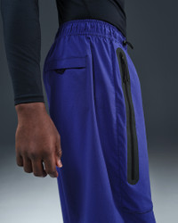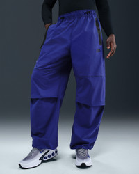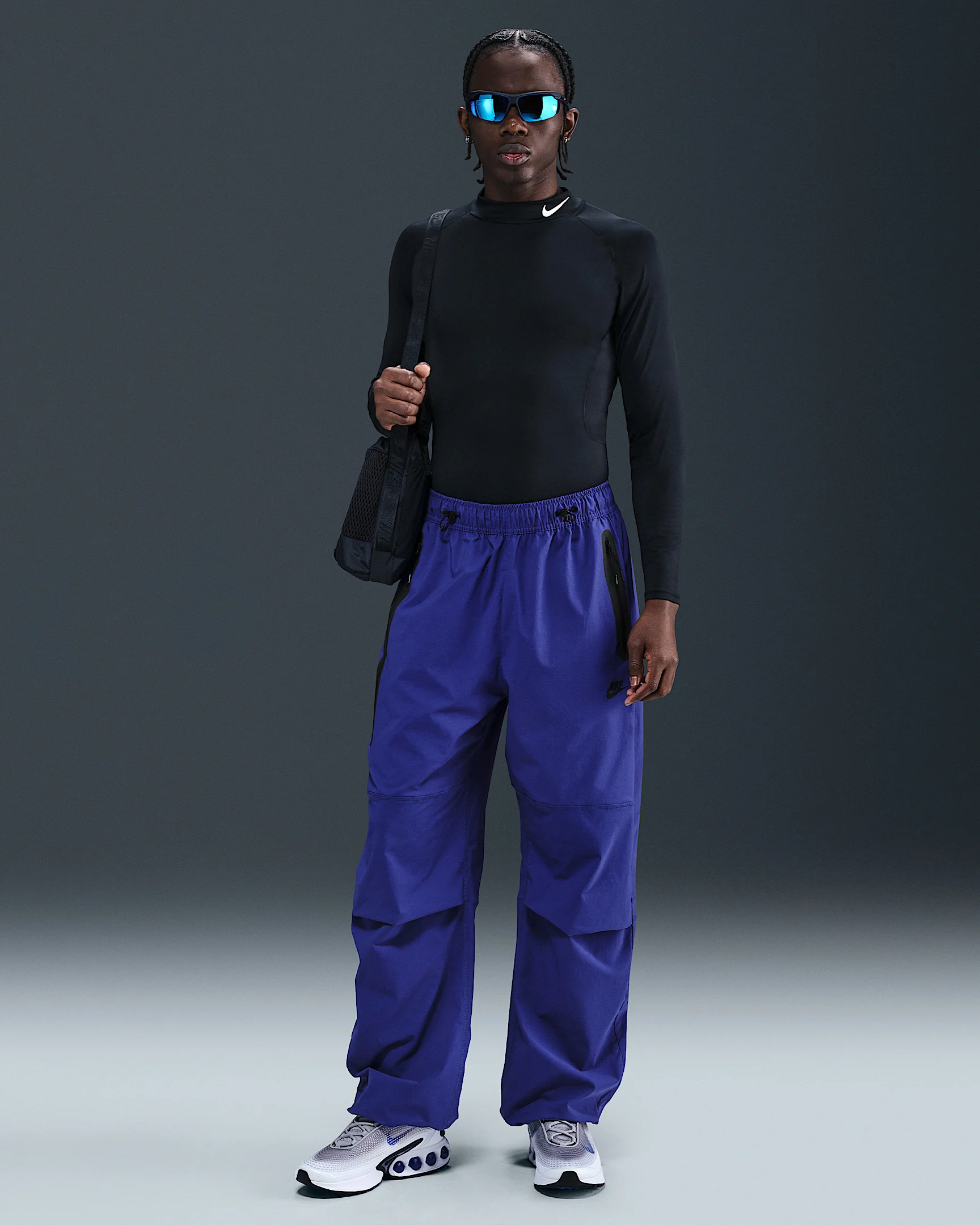 Crafted with stretchy woven material, these Nike Tech pants offer you ease of movement and adjustability. The wide-leg cut is paired with bungee locks at the ankles that let you switch up the fit. Benefits - Lightweight fabric moves sweat away from your skin for quick evaporation, helping you stay dry and comfortable. - Oversized fit offers plenty of space through the thighs and legs. - Articulated knees are made with movement in mind, and add a distinct Nike Tech aesthetic. - Stretchy elastic waistband with bungee drawcord provides a custom fit. Product Details - Nike Futura logo - Extralong taped Tech pocket - Hand pocket on the left - Body: 94% nylon/6% spandex. Pocket Bags: 100% polyester. - Machine wash - Imported - Shown: Deep Night/Deep Night/Black - Style: HM7158-539 SIZE & FIT Model is wearing size M and is 6′1″185cm Big & Tall model is wearing size 3XL and is 6'3"191cm Oversized fit: exaggerated and spacious 78 length: hits at ankle