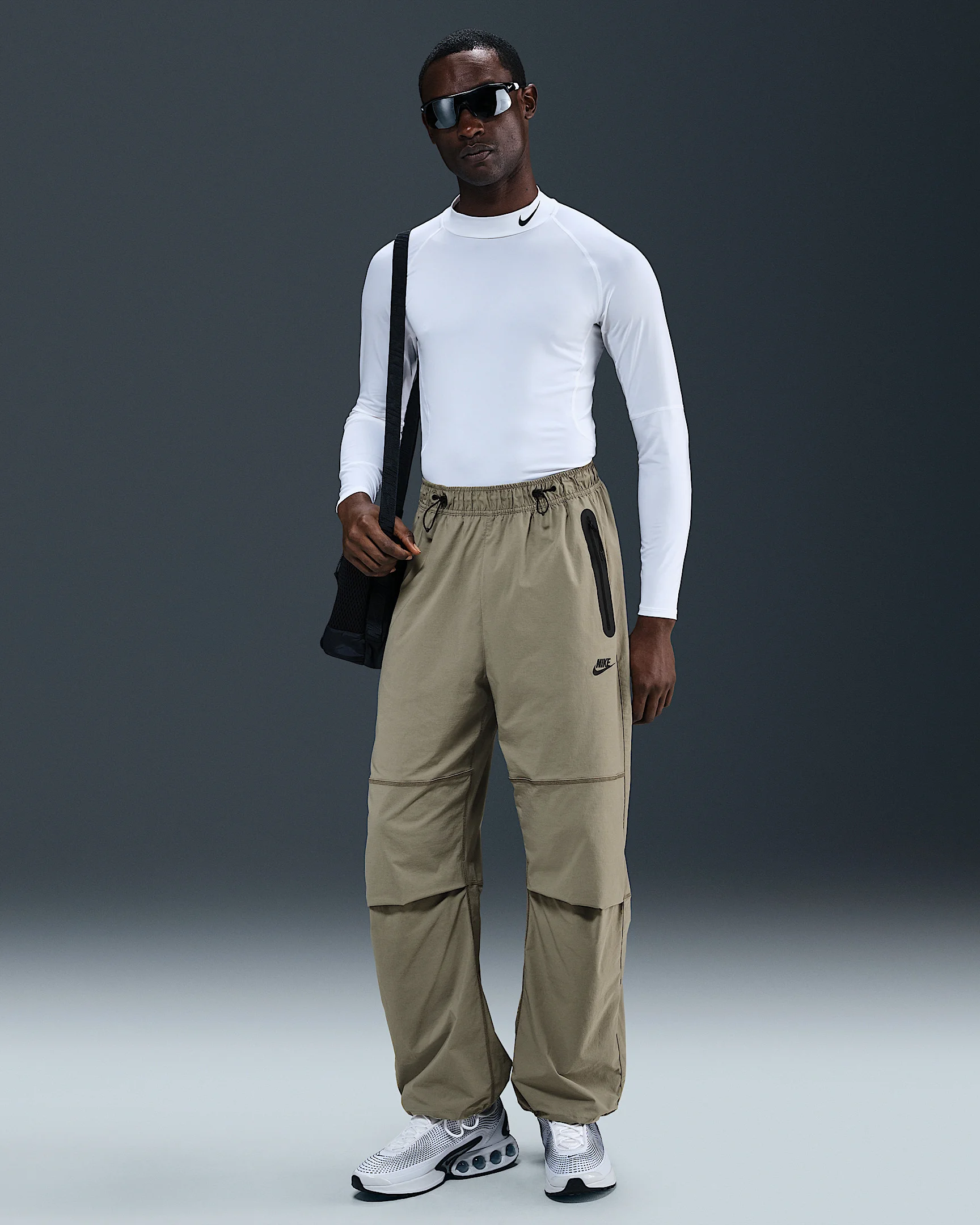 Crafted with stretchy woven material, these Nike Tech pants offer you ease of movement and adjustability. The wide-leg cut is paired with bungee locks at the ankles that let you switch up the fit. Benefits - Lightweight fabric moves sweat away from your skin for quick evaporation, helping you stay dry and comfortable. - Oversized fit offers plenty of space through the thighs and legs. - Articulated knees are made with movement in mind, and add a distinct Nike Tech aesthetic. - Stretchy elastic waistband with bungee drawcord provides a custom fit. Product Details - Nike Futura logo - Extralong taped Tech pocket - Hand pocket on the left - Body: 94% nylon/6% spandex. Pocket Bags: 100% polyester. - Machine wash - Imported - Shown: Light Army/Light Army/Black - Style: HM7158-320 SIZE & FIT Model is wearing size M and is 6′1″185cm Big & Tall model is wearing size 3XL and is 6'5"196cm Oversized fit: exaggerated and spacious 78 length: hits at ankle