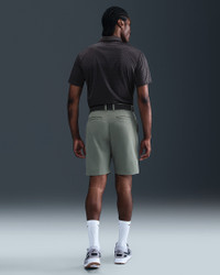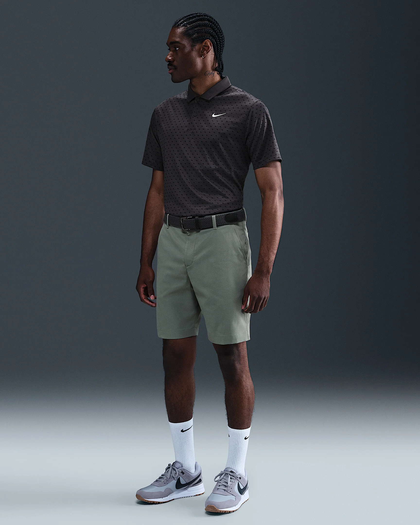 From driving range to course to clubhouse, do it all in the Nike Tour Chino Golf Shorts. Cut with a relaxed and streamlined fit, they help you feel confident through each swing with stretchy, sweat-wicking woven fabric. Got a scorecard, yardage book and tees? There's plenty of pockets for your essentials. Benefits - Stretch-woven fabric helps you get the most out of your swing. - Water-repellent finish helps keep you dry in wet weather. - Elastic waistband with a snap-hook-and-bar closure provides a snug fit. - Mesh-lined pockets hold your golf essentials like a scorecard, pen and yardage book. Product Details - 8" inseam - Body and pocket bags: 100% polyester. - Machine wash - Imported - Shown: Clay Green/Clay Green - Style: FD5721-364 SIZE & FIT Model is wearing size 32 and is 6′2″188cm Standard fit: easy and traditional Fits small; we recommend ordering a size up