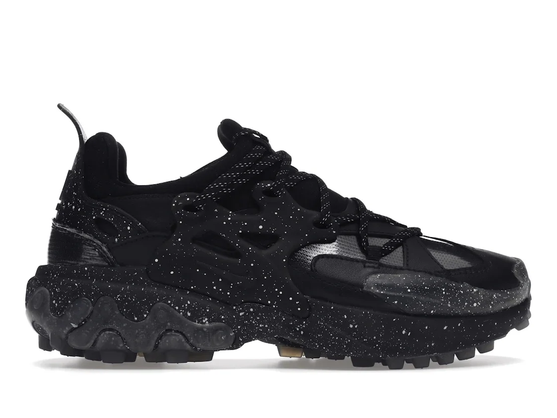 The Nike React Presto Undercover Black was designed as part of the collaboration between the Japanese streetwear brand and Nike that combines the classic look of the Presto and modern iteration design details. This silhouette arrives in a black/white-black-black colorway. The Nike React Presto Undercover Black is constructed in black leather and black neoprene that form the base with speckled white on the black synthetic overlays on the lace cage, heel, midsole, and toe. The high-tech carbon fiber-like layout on the forefoot and toe delivers the silhouette’s stealthy look. Black laces with white speckling complete the top black neoprene tongue, while the React foam sole offers a soft, responsive ride. Something our experts love about the Undercover in Black shoe by Nike and Presto is the cozy upper form that combines with the sport brand’s latest and futuristic React midsole providing comfort from the heel to the toe. The Nike React Presto Undercover Black was released on January 28th, 2020, and sold for $180. - Style CU3459-001 - Colorway Black/White-Black-Black - Retail Price 180 - Release Date 2020-01-28 - Featured false