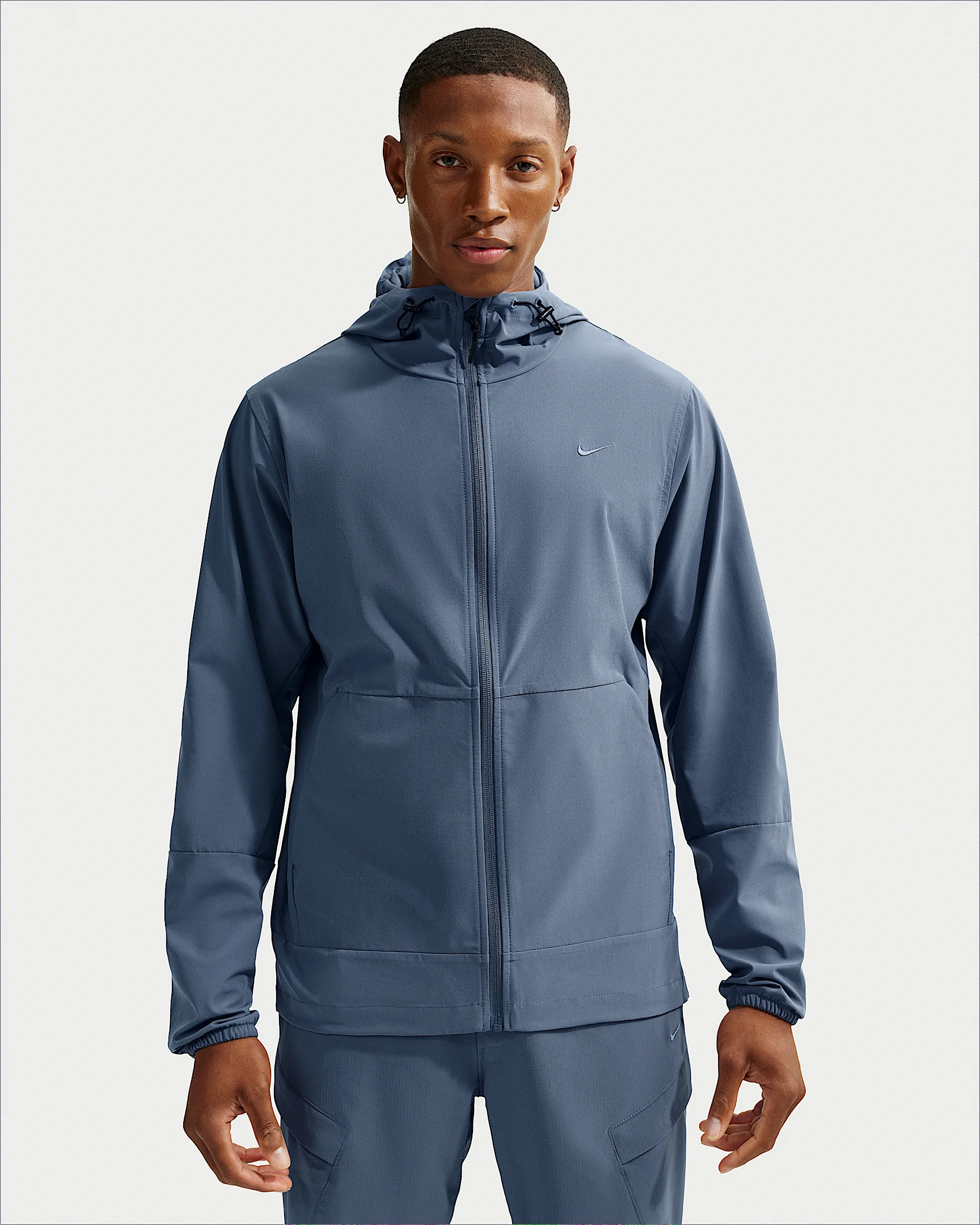 Built for running, training and yoga, our Unlimited collection helps keep you moving throughout the year, thanks to its premium materials and innovative features. This breathable jacket is built around super stretchy fabric that moves with you from box jumps to back bends. Durable water-repellent coating helps keep you prepared for unexpected showers. Plus, it neatly packs down into a slim, built-in pouch for maximum convenience and space saving in your gym bag. Benefits - Hood with drawcord lets you cinch up your perfect fit. - Front pockets give easy-to-reach storage and help your hands stay warm. - Repel sheds rain and moves sweat away from your skin. - Full-zip design helps you easily change in and out of the jacket. - Midweight woven fabric has plenty of stretch through your full range of motion. Product Details - 85% polyester/15% spandex - Machine wash - Imported - Not intended for use as Personal Protective Equipment (PPE) - Shown: Diffused Blue/Black/Diffused Blue - Style: FB7551-491 SIZE & FIT Model is wearing size M and is 5'11"179cm Standard fit: easy and traditional
