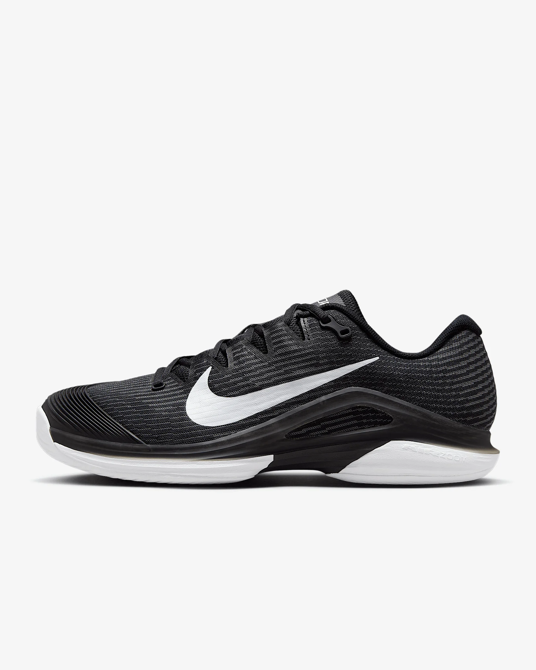 Get to every single ball with blistering speed in the Vapor 12. With a reworked upper and traction pattern, it's lighter and more responsive than the 11. And we brought back Air Zoom cushioning, so you can always be on the attack. More Benefits - Full midfoot fit band allows you to pull the laces tighter to enhance the fit and enable faster cuts. - Midsole foam in between the plastic and rubber, which wasn’t on the Vapor 11, helps keep you light on your feet. Product Details - Designed for wear on hard court surfaces - Cushioned insole - Shown: Black/Dark Smoke Grey/White - Style: FV5552-001