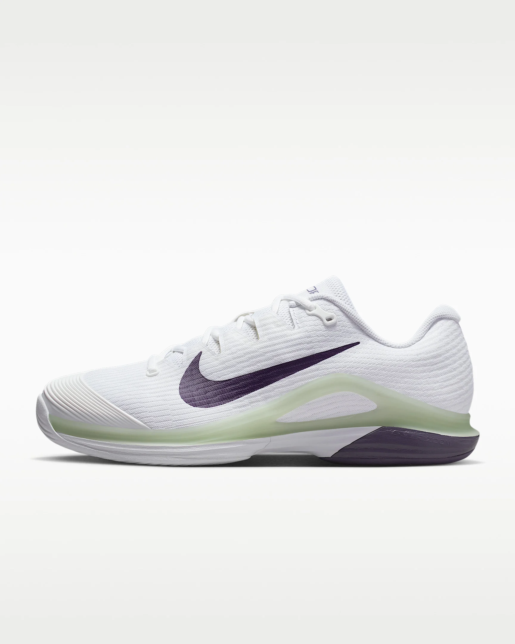 Get to every single ball with blistering speed in the Vapor 12. With a reworked upper and traction pattern, it's lighter and more responsive than the 11. And we brought back Air Zoom cushioning, so you can always be on the attack. More Benefits - Full midfoot fit band allows you to pull the laces tighter to enhance the fit and enable faster cuts. - Midsole foam in between the plastic and rubber, which wasn’t on the Vapor 11, helps keep you light on your feet. Product Details - Designed for wear on hard court surfaces - Cushioned insole - Shown: White/Volt Tint/Dark Raisin - Style: FV5552-108