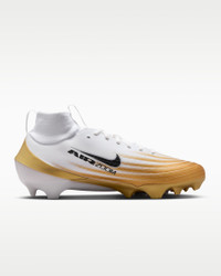 With Air Zoom cushioning so responsive you’ll burst off the line of scrimmage, the Nike Vapor Pro 1 is designed to help you take your speed to the next level. Benefits - Mesh combines with inner sleeve to provide a breathable, snug fit. - Forefoot Air Zoom unit stitched to the upper offers unreal responsiveness when making sudden, swift moves. - Vapor plate is lightweight, yet structurally strong. - Wide stud placement ensures optimal multidirectional traction. - Molded plastic around the heel offers stability for your ankle and Achilles. Product Details - Shown: White/Metallic Gold/Black - Style: FB3298-103