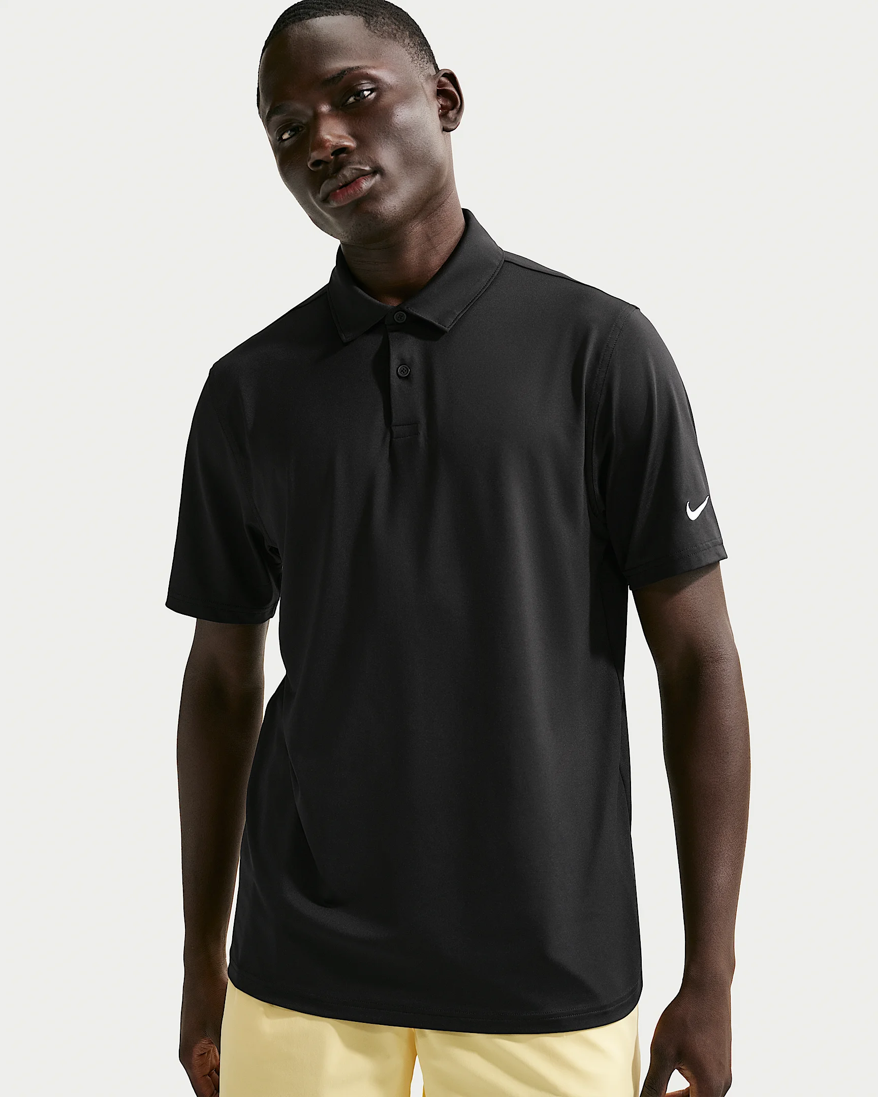 Lightweight and breathable, this sweat-wicking polo helps keep you dry on and off the course. Some stretch in the fabric allows you to move with ease through your biggest rounds of the year. Benefits - Smooth four-way stretchy fabric allows you to move through your swing without restriction. - Fabric has a subtle sheen and drape for a polished look on and off the course. - Nike Dri-FIT technology moves sweat away from your skin for quicker evaporation, helping you stay dry and comfortable. Product Details - 90% polyester/10% spandex - Embroidered Swoosh logo - 2-button placket - Straight bottom hem - Machine wash - Imported - Shown: Black/White - Style: IQ6689-010 SIZE & FIT Model is wearing size M and is 6′1″184cm Standard fit: easy and traditional