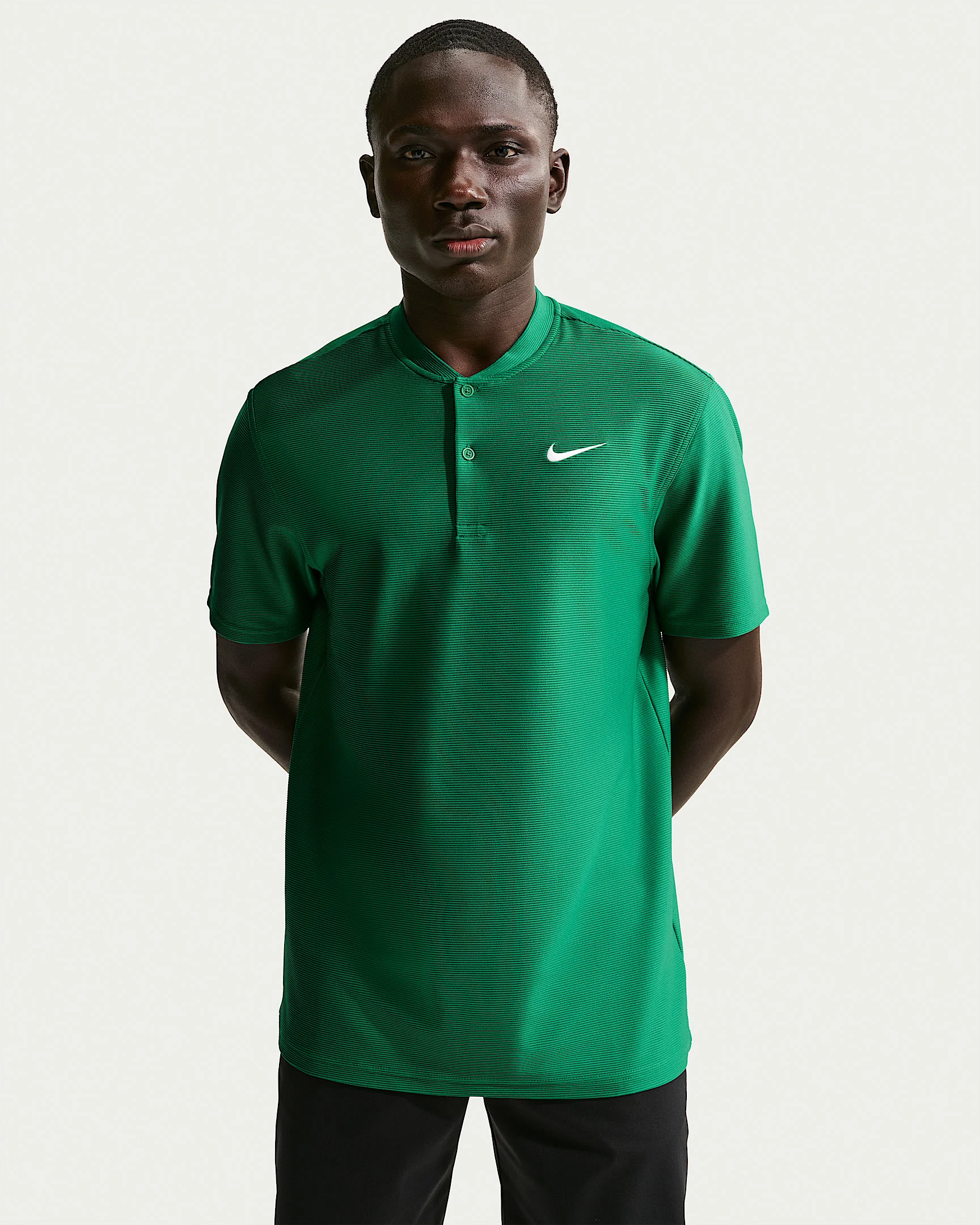 Lightweight and breathable, this sweat-wicking polo helps keep you dry on and off the course. Some stretch in the ribbed fabric allows you to move with ease through your biggest rounds of the year. Benefits - Smooth four-way stretchy fabric allows you to move through your swing without restriction. - Fabric has a subtle sheen and drape for a polished look on and off the course. - Nike Dri-FIT technology moves sweat away from your skin for quicker evaporation, helping you stay dry and comfortable. Product Details - Four-way stretch knit fabric - This product provides UVA and UVB protection from the sun only in the areas covered by the garment. To protect exposed areas, the use of good quality sunscreen is recommended. - 2-button placket - 86% polyester/14% spandex - Machine wash - Imported - Shown: Malachite/White - Style: IB0278-365 SIZE & FIT Model is wearing size M and is 6′1″184cm Standard fit: easy and traditional