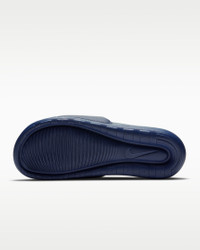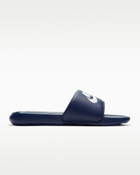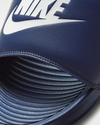 From the beach to the bleachers, the Victori One is a must-have slide for everyday activities. Subtle yet substantial updates like a wider strap and softer foam make lounging easy. Go ahead—enjoy endless comfort for your feet. Benefits - Soft foam adds responsiveness and cushioning. - Textured pattern on the contoured footbed adds grip to help your feet stay in place. - Rolled edges on the padded strap creates a smooth, comfortable feel. - Wider strap provides additional space to help accommodate more sizes. - Outsole pattern is designed for multi-surface traction. Product Details - Shown: Midnight Navy/Midnight Navy/White - Style: CN9675-401