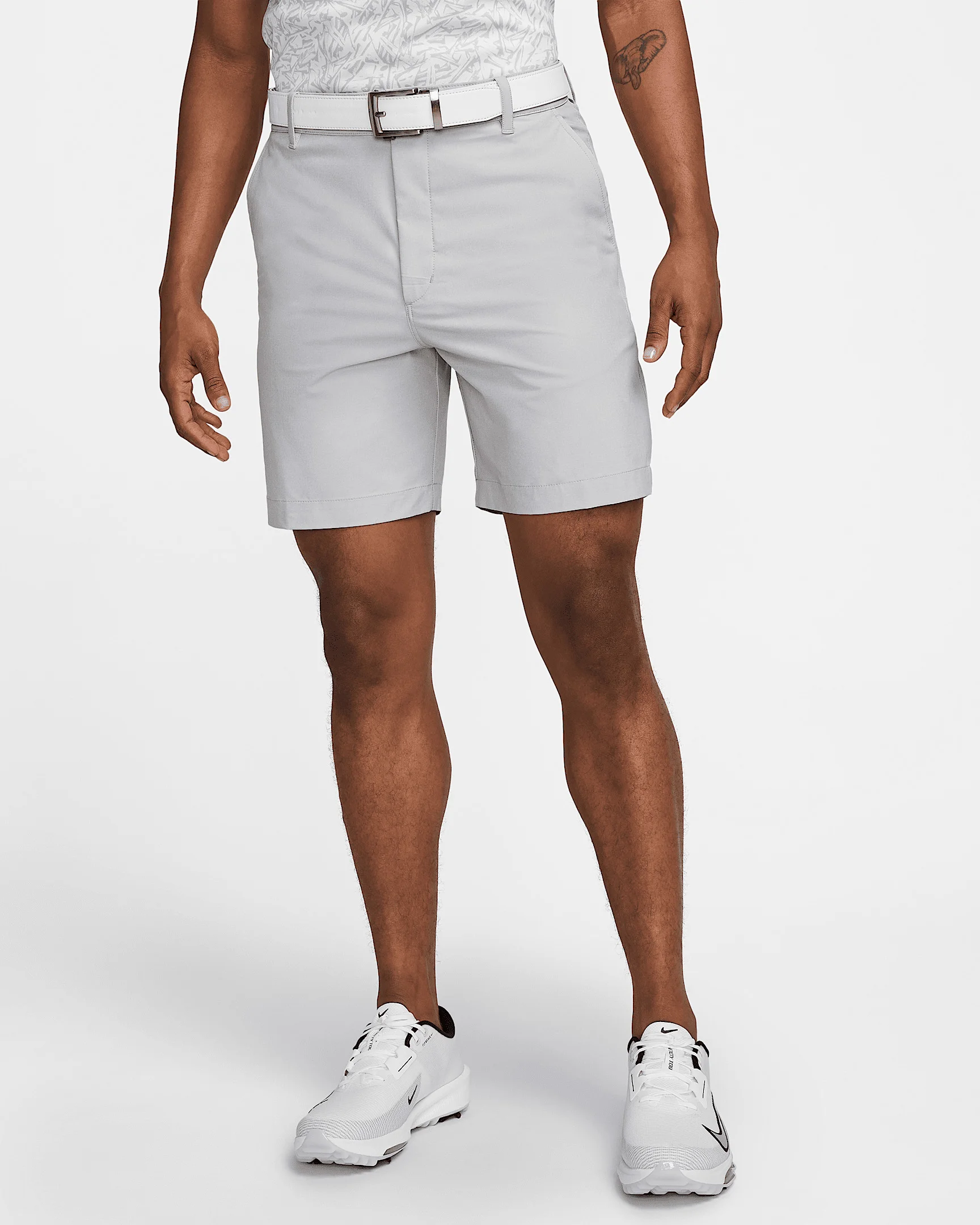 Tailored for golf, the Victory shorts have a versatile fit with smooth, stretchy fabric and a 7" inseam that hits above the knee. Nike Dri-FIT technology moves sweat away from your skin for quicker evaporation, helping you stay dry and comfortable. Side and back pockets hold essentials like tees, extra balls or a scorecard. Benefits - Smooth woven fabric has plenty of stretch to help you move naturally. - Elastic waistband provides a secure fit. - Silicone inside the waistband helps keep your top from coming untucked. Product Details - Front button and zipper closure - Belt loops - Body: 89% polyester/11% spandex. Pocket bag: 100% polyester. - Machine wash - Imported - Shown: Wolf Grey/White/Wolf Grey - Style: FZ7444-012 SIZE & FIT Model is wearing size 32 and is 6′2″188cm Standard fit: easy and traditional