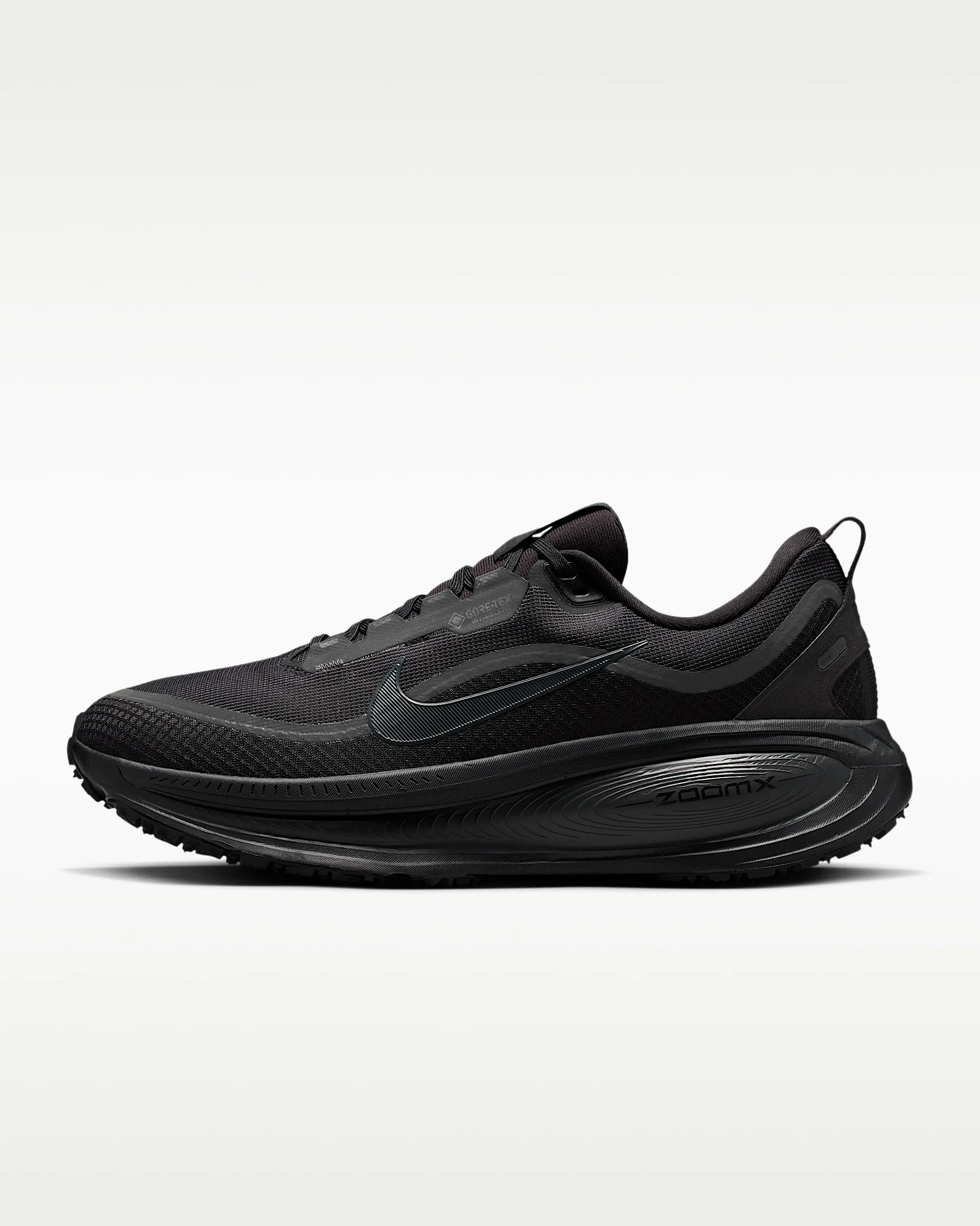 Maximum cushioning in the winterized Vomero 18 delivers a comfortable ride for rainy road runs. Experience optimal comfort with lightweight ZoomX foam stacked on top of responsive ReactX foam in the midsole. Plus, a waterproof GORE-TEX upper and reflective details throughout help you comfortably take on the elements. More Benefits - Waterproof GORE-TEX liner and mesh upper - ZoomX foam stacked on top of ReactX foam - Higher stack height compared to Vomero 17 - 13% more responsive than previous React technology Product Details - Reflective details on upper - Not intended for use as Personal Protective Equipment (PPE) - Weight: Approx. 329g/9 oz (Men's US 10) - Heel-to-toe drop: 10mm - Shown: Black/Anthracite - Style: HQ7001-001
